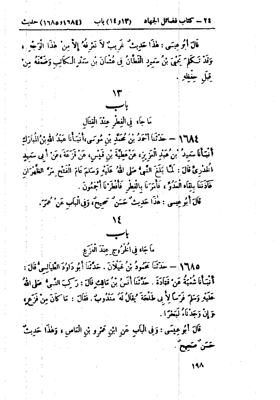 1684 - حَدَّثَنَا أَحْمَدُ بْنُ مُحَمَّدِ بْنِ مُوسَى قَالَ: حَدَّثَنَا عَبْدُ اللَّهِ بْنُ المُبَارَكِ قَالَ: حَدَّثَنَا سَعِيدُ بْنُ عَبْدِ العَزِيزِ، عَنْ عَطِيَّةَ بْنِ قَيْسٍ، عَنْ قَزَعَةَ، عَنْ أَبِي سَعِيدٍ الخُدْرِيِّ قَالَ: لَمَّا بَلَغَ النَّبِيُّ صَلَّى اللَّهُ عَلَيْهِ وَسَلَّمَ عَامَ الفَتْحِ مَرَّ الظَّهْرَانِ، فَآذَنَنَا بِلِقَاءِ العَدُوِّ «§فَأَمَرَنَا بِالفِطْرِ»، فَأَفْطَرْنَا أَجْمَعُونَ: هَذَا حَدِيثٌ حَسَنٌ صَحِيحٌ وَفِي البَاب عَنْ عُمَرَ
