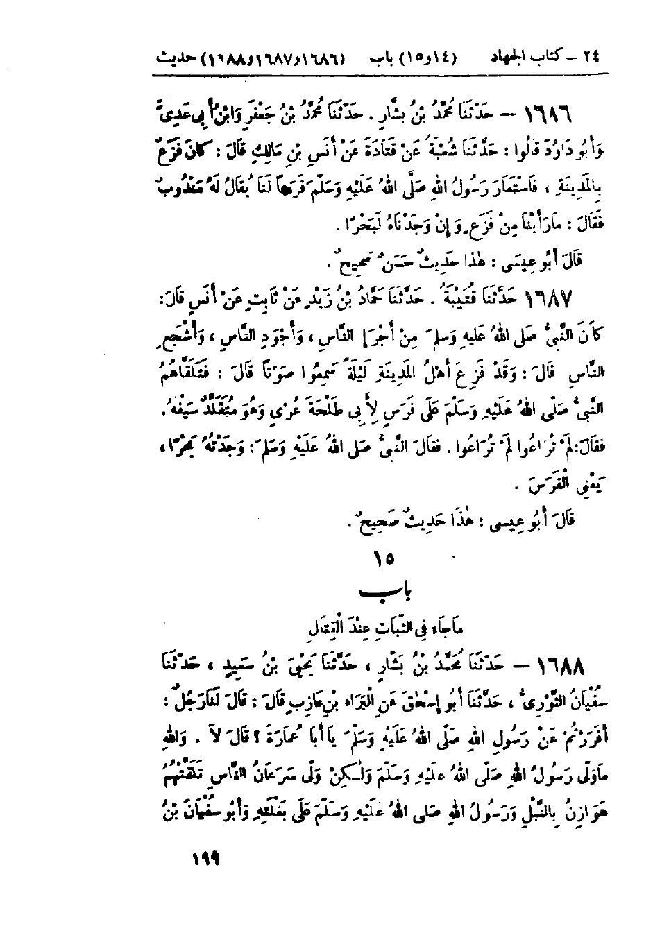 1688 - حَدَّثَنَا مُحَمَّدُ بْنُ بَشَّارٍ قَالَ: حَدَّثَنَا يَحْيَى بْنُ سَعِيدٍ قَالَ: حَدَّثَنَا سُفْيَانُ الثَّوْرِيُّ قَالَ: حَدَّثَنَا أَبُو إِسْحَاقَ، عَنْ البَرَاءِ بِنِ عَازِبٍ قَالَ: قَالَ لَنَا رَجُلٌ: أَفَرَرْتُمْ عَنْ رَسُولِ اللَّهِ صَلَّى اللَّهُ عَلَيْهِ وَسَلَّمَ يَا أَبَا عُمَارَةَ؟ قَالَ: لَا وَاللَّهِ، مَا وَلَّى رَسُولُ اللَّهِ صَلَّى اللَّهُ عَلَيْهِ وَسَلَّمَ، وَلَكِنْ وَلَّى سَرَعَانُ النَّاسِ تَلَقَّتْهُمْ هَوَازِنُ بِالنَّبْلِ، وَرَسُولُ اللَّهِ صَلَّى اللَّهُ عَلَيْهِ وَسَلَّمَ عَلَى بَغْلَتِهِ، وَأَبُو سُفْيَانَ بْنُ -[200]- الحَارِثِ بْنِ عَبْدِ المُطَّلِبِ آخِذٌ بِلِجَامِهَا، وَرَسُولُ اللَّهِ صَلَّى اللَّهُ عَلَيْهِ وَسَلَّمَ يَقُولُ: «§أَنَا النَّبِيُّ لَا كَذِبْ , أَنَا ابْنُ عَبْدِ المُطَّلِبْ»: وَفِي البَاب عَنْ عَلِيٍّ، وَابْنِ عُمَرَ. وَهَذَا حَدِيثٌ حَسَنٌ صَحِيحٌ