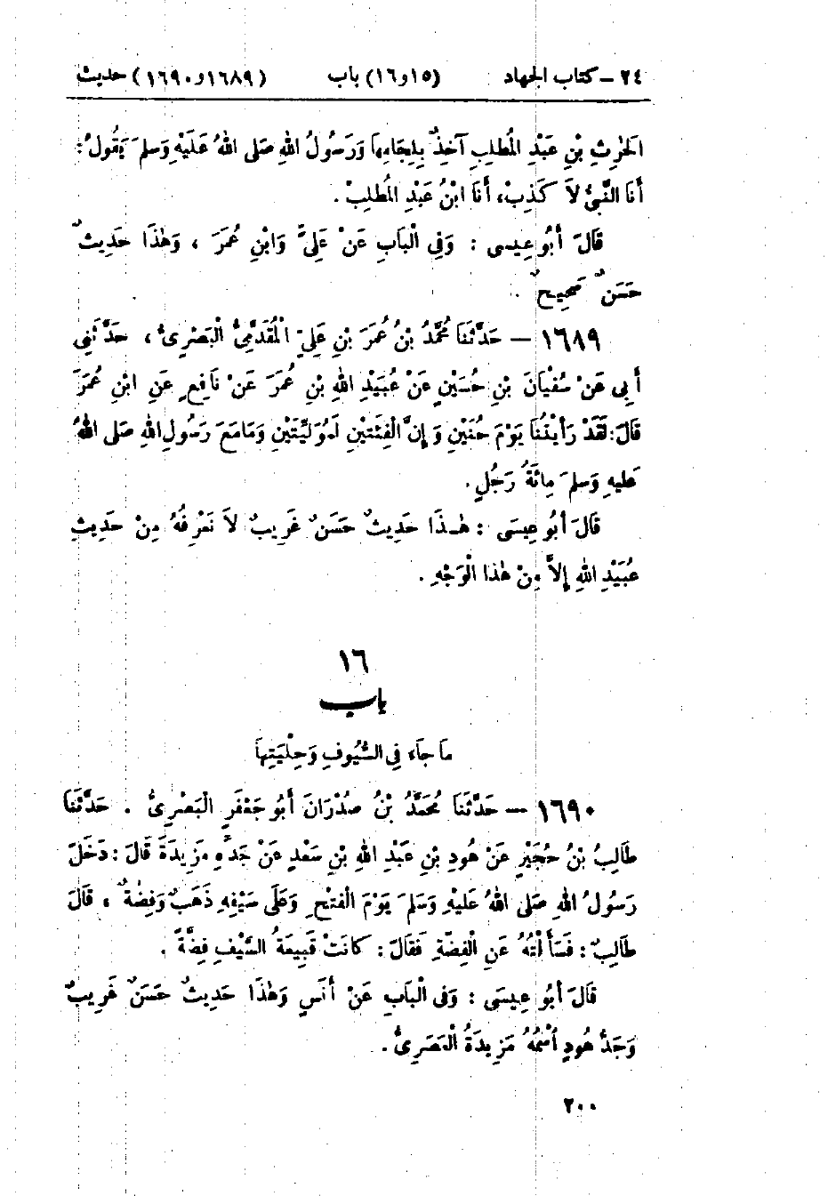 1690 - حَدَّثَنَا مُحَمَّدُ بْنُ صُدْرَانَ أَبُو جَعْفَرٍ البَصْرِيُّ قَالَ: حَدَّثَنَا طَالِبُ بْنُ حُجَيْرٍ، عَنْ هُودِ بْنِ عَبْدِ اللَّهِ بْنِ سَعْدٍ، عَنْ جَدِّهِ مَزِيدَةَ قَالَ: " دَخَلَ رَسُولُ اللَّهِ صَلَّى اللَّهُ عَلَيْهِ وَسَلَّمَ يَوْمَ الفَتْحِ §وَعَلَى سَيْفِهِ ذَهَبٌ وَفِضَّةٌ قَالَ طَالِبٌ: فَسَأَلْتُهُ عَنِ الفِضَّةِ؟ فَقَالَ: «كَانَتْ قَبِيعَةُ السَّيْفِ فِضَّةً»: وَفِي البَاب عَنْ أَنَسٍ وَهَذَا حَدِيثٌ غَرِيبٌ وَجَدُّ هُودٍ: اسْمُهُ مَزِيدَةُ العَصَرِيُّ