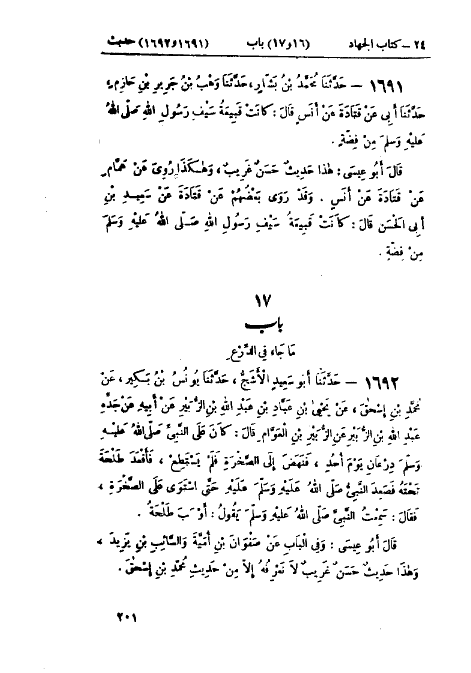 1691 - حَدَّثَنَا مُحَمَّدُ بْنُ بَشَّارٍ، حَدَّثَنَا وَهْبُ بْنُ جَرِيرِ بْنِ حَازِمٍ قَالَ: حَدَّثَنَا أَبِي، عَنْ قَتَادَةَ، عَنْ أَنَسٍ قَالَ: «§كَانَتْ قَبِيعَةُ سَيْفِ رَسُولِ اللَّهِ صَلَّى اللَّهُ عَلَيْهِ وَسَلَّمَ مِنْ فِضَّةٍ»: هَذَا حَدِيثٌ حَسَنٌ غَرِيبٌ. وَهَكَذَا رُوِيَ عَنْ هَمَّامٍ، عَنْ قَتَادَةَ، عَنْ أَنَسٍ، وَقَدْ رَوَى بَعْضُهُمْ، عَنْ قَتَادَةَ، عَنْ سَعِيدِ بْنِ أَبِي الحَسَنِ قَالَ: «كَانَتْ قَبِيعَةُ سَيْفِ رَسُولِ اللَّهِ صَلَّى اللَّهُ عَلَيْهِ وَسَلَّمَ مِنْ فِضَّةٍ»
