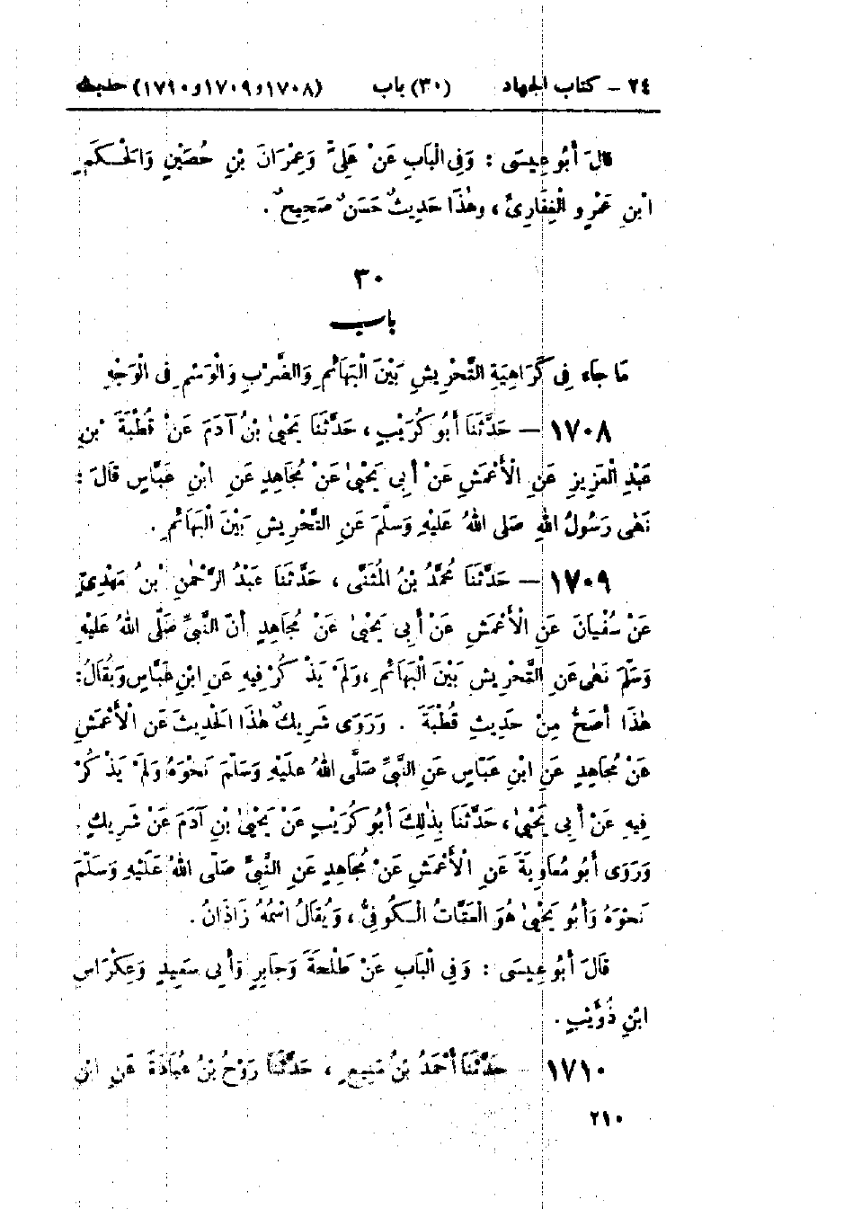 1709 - حَدَّثَنَا مُحَمَّدُ بْنُ المُثَنَّى قَالَ: حَدَّثَنَا عَبْدُ الرَّحْمَنِ بْنُ مَهْدِيٍّ، عَنْ سُفْيَانَ، عَنْ الأَعْمَشِ، عَنْ أَبِي يَحْيَى، عَنْ مُجَاهِدٍ، «أَنَّ النَّبِيَّ صَلَّى اللَّهُ عَلَيْهِ وَسَلَّمَ §نَهَى عَنِ التَّحْرِيشِ بَيْنَ البَهَائِمِ» وَلَمْ يَذْكُرْ فِيهِ عَنْ ابْنِ عَبَّاسٍ، وَيُقَالُ: هَذَا أَصَحُّ مِنْ حَدِيثِ قُطْبَةَ وَرَوَى شَرِيكٌ هَذَا الحَدِيثَ، عَنِ الأَعْمَشِ، عَنْ مُجَاهِدٍ، عَنْ ابْنِ عَبَّاسٍ، عَنِ النَّبِيِّ صَلَّى اللَّهُ عَلَيْهِ وَسَلَّمَ نَحْوَهُ. وَلَمْ يَذْكُرْ فِيهِ عَنْ أَبِي يَحْيَى حَدَّثَنَا بِذَلِكَ أَبُو كُرَيْبٍ، عَنْ يَحْيَى بْنِ آدَمَ، عَنْ شَرِيكٍ، وَرَوَى أَبُو مُعَاوِيَةَ، عَنِ الأَعْمَشِ، عَنْ مُجَاهِدٍ، عَنِ النَّبِيِّ صَلَّى اللَّهُ عَلَيْهِ وَسَلَّمَ نَحْوَهُ. وَرَوَاهُ ابْنُ فُضَيْلٍ، عَنْ لَيْثٍ، عَنِ ابْنِ عُمَرَ، مَرْفُوعًا وَأَبُو يَحْيَى هُوَ القَتَّاتُ الكُوفِيُّ، وَيُقَالُ اسْمُهُ: زَاذَانُ. وَفِي البَاب عَنْ طَلْحَةَ، وَجَابِرٍ، وَأَبِي سَعِيدٍ، وَعِكْرَاشِ بْنِ ذُؤَيْبٍ