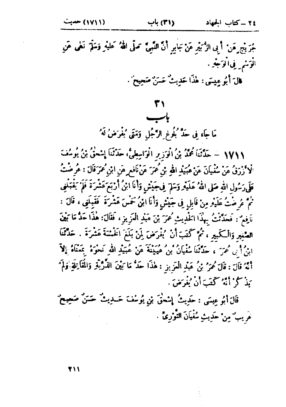 1711 - حَدَّثَنَا مُحَمَّدُ بْنُ الوَزِيرِ الوَاسِطِيُّ قَالَ: حَدَّثَنَا إِسْحَاقُ بْنُ يُوسُفَ الأَزْرَقُ، عَنْ سُفْيَانَ، عَنْ عُبَيْدِ اللَّهِ بْنِ عُمَرَ، عَنْ نَافِعٍ، عَنْ ابْنِ عُمَرَ قَالَ: «§عُرِضْتُ عَلَى رَسُولِ اللَّهِ صَلَّى اللَّهُ عَلَيْهِ وَسَلَّمَ فِي جَيْشٍ وَأَنَا ابْنُ أَرْبَعَ عَشْرَةَ فَلَمْ يَقْبَلْنِي، ثُمَّ عُرِضْتُ عَلَيْهِ مِنْ قَابِلٍ فِي جَيْشٍ وَأَنَا ابْنُ خَمْسَ عَشْرَةَ فَقَبِلَنِي» قَالَ نَافِعٌ: فَحَدَّثْتُ بِهَذَا الحَدِيثِ عُمَرَ بْنَ عَبْدِ العَزِيزِ، فَقَالَ: «هَذَا حَدُّ مَا بَيْنَ الصَّغِيرِ وَالكَبِيرِ، ثُمَّ كَتَبَ أَنْ يُفْرَضَ لِمَنْ بَلَغَ الخَمْسَ عَشْرَةَ» حَدَّثَنَا ابْنُ أَبِي عُمَرَ قَالَ: حَدَّثَنَا سُفْيَانُ بْنُ عُيَيْنَةَ، عَنْ عُبَيْدِ اللَّهِ نَحْوَهُ بِمَعْنَاهُ، إِلَّا أَنَّهُ قَالَ: قَالَ عُمَرُ بْنُ عَبْدِ العَزِيزِ هَذَا حَدُّ مَا بَيْنَ الذُّرِّيَّةِ وَالمُقَاتِلَةِ " وَلَمْ يَذْكُرْ أَنَّهُ كَتَبَ أَنْ يُفْرَضَ: حَدِيثُ إِسْحَاقَ بْنِ يُوسُفَ حَدِيثٌ حَسَنٌ صَحِيحٌ غَرِيبٌ مِنْ حَدِيثِ سُفْيَانَ الثَّوْرِيِّ