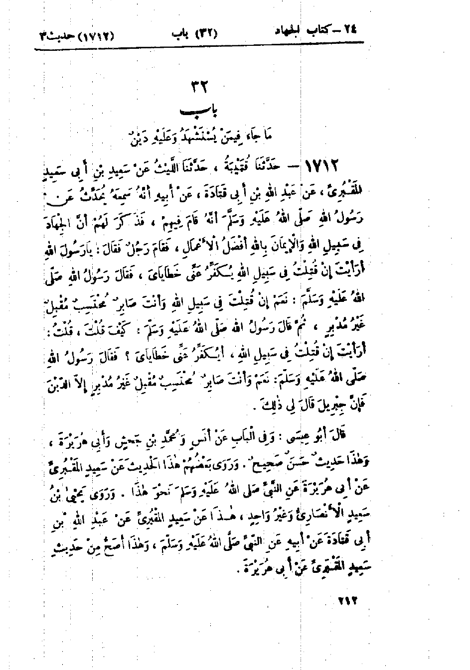 1712 - حَدَّثَنَا قُتَيْبَةُ قَالَ: حَدَّثَنَا اللَّيْثُ، عَنْ سَعِيدِ بْنِ أَبِي سَعِيدٍ المَقْبُرِيِّ، عَنْ عَبْدِ اللَّهِ بْنِ أَبِي قَتَادَةَ، عَنْ أَبِيهِ، أَنَّهُ سَمِعَهُ يُحَدِّثُ عَنْ رَسُولِ اللَّهِ صَلَّى اللَّهُ عَلَيْهِ وَسَلَّمَ أَنَّهُ قَامَ فِيهِمْ، فَذَكَرَ لَهُمْ: «أَنَّ §الجِهَادَ فِي سَبِيلِ اللَّهِ، وَالإِيمَانَ بِاللَّهِ أَفْضَلُ الأَعْمَالِ»، فَقَامَ رَجُلٌ، فَقَالَ: يَا رَسُولَ اللَّهِ، أَرَأَيْتَ إِنْ قُتِلْتُ فِي سَبِيلِ اللَّهِ، يُكَفِّرُ عَنِّي خَطَايَايَ؟ فَقَالَ رَسُولُ اللَّهِ صَلَّى اللَّهُ عَلَيْهِ وَسَلَّمَ: «نَعَمْ، إِنْ قُتِلْتَ فِي سَبِيلِ اللَّهِ وَأَنْتَ صَابِرٌ مُحْتَسِبٌ مُقْبِلٌ غَيْرُ مُدْبِرٍ»، ثُمَّ قَالَ رَسُولُ اللَّهِ صَلَّى اللَّهُ عَلَيْهِ وَسَلَّمَ: «كَيْفَ قُلْتَ؟» قَالَ: أَرَأَيْتَ إِنْ قُتِلْتُ فِي سَبِيلِ اللَّهِ أَيُكَفِّرُ عَنِّي خَطَايَايَ؟ فَقَالَ رَسُولُ اللَّهِ صَلَّى اللَّهُ عَلَيْهِ وَسَلَّمَ: «نَعَمْ، وَأَنْتَ صَابِرٌ مُحْتَسِبٌ مُقْبِلٌ غَيْرُ مُدْبِرٍ، إِلَّا الدَّيْنَ، فَإِنَّ جِبْرِيلَ قَالَ لِي ذَلِكَ»: وَفِي البَاب عَنْ أَنَسٍ، وَمُحَمَّدِ بْنِ جَحْشٍ، وَأَبِي هُرَيْرَةَ وَهَذَا حَدِيثٌ حَسَنٌ صَحِيحٌ وَرَوَى بَعْضُهُمْ هَذَا الحَدِيثَ، عَنْ سَعِيدٍ المَقْبُرِيِّ، عَنْ أَبِي هُرَيْرَةَ، عَنِ النَّبِيِّ صَلَّى اللَّهُ عَلَيْهِ وَسَلَّمَ نَحْوَ هَذَا. وَرَوَى يَحْيَى بْنُ سَعِيدٍ الأَنْصَارِيُّ، وَغَيْرُ وَاحِدٍ هَذَا، عَنْ سَعِيدٍ المَقْبُرِيِّ، عَنْ عَبْدِ اللَّهِ بْنِ أَبِي قَتَادَةَ، عَنْ أَبِيهِ، عَنِ النَّبِيِّ صَلَّى اللَّهُ عَلَيْهِ وَسَلَّمَ. وَهَذَا أَصَحُّ مِنْ حَدِيثِ سَعِيدٍ المَقْبُرِيِّ عَنْ أَبِي هُرَيْرَةَ