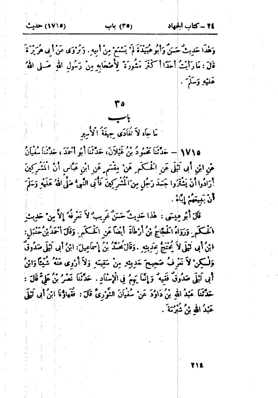 1715 - حَدَّثَنَا مَحْمُودُ بْنُ غَيْلَانَ قَالَ: حَدَّثَنَا أَبُو أَحْمَدَ قَالَ: حَدَّثَنَا سُفْيَانُ، عَنْ ابْنِ أَبِي لَيْلَى، عَنْ الحَكَمِ، عَنْ مِقْسَمٍ، عَنْ ابْنِ عَبَّاسٍ، «أَنَّ §المُشْرِكِينَ أَرَادُوا أَنْ يَشْتَرُوا جَسَدَ رَجُلٍ مِنَ المُشْرِكِينَ، فَأَبَى النَّبِيُّ صَلَّى اللَّهُ عَلَيْهِ وَسَلَّمَ أَنْ يَبِيعَهُمْ إِيَّاهُ»: هَذَا حَدِيثٌ غَرِيبٌ لَا نَعْرِفُهُ إِلَّا مِنْ حَدِيثِ الحَكَمِ وَرَوَاهُ الحَجَّاجُ بْنُ أَرْطَاةَ أَيْضًا، عَنِ الحَكَمِ وقَالَ أَحْمَدُ بْنُ الْحَسَنِ: سَمِعْتُ أَحْمَدَ بْنَ حَنْبَلٍ يَقُولُ: ابْنُ أَبِي لَيْلَى لَا يُحْتَجُّ بِحَدِيثِهِ وقَالَ مُحَمَّدُ بْنُ إِسْمَاعِيلَ: ابْنُ أَبِي لَيْلَى صَدُوقٌ، وَلَكِنْ لَا نَعْرِفُ صَحِيحَ حَدِيثِهِ مِنْ سَقِيمِهِ، وَلَا أَرْوِي عَنْهُ شَيْئًا، وَابْنُ أَبِي لَيْلَى صَدُوقٌ فَقِيهٌ، وَرُبَّمَا يَهِمُ فِي الإِسْنَادِ حَدَّثَنَا نَصْرُ بْنُ عَلِيٍّ قَالَ: حَدَّثَنَا عَبْدُ اللَّهِ بْنُ دَاوُدَ، عَنْ سُفْيَانَ الثَّوْرِيِّ قَالَ: فُقَهَاؤُنَا ابْنُ أَبِي لَيْلَى وَعَبْدُ اللَّهِ بْنُ شُبْرُمَةَ