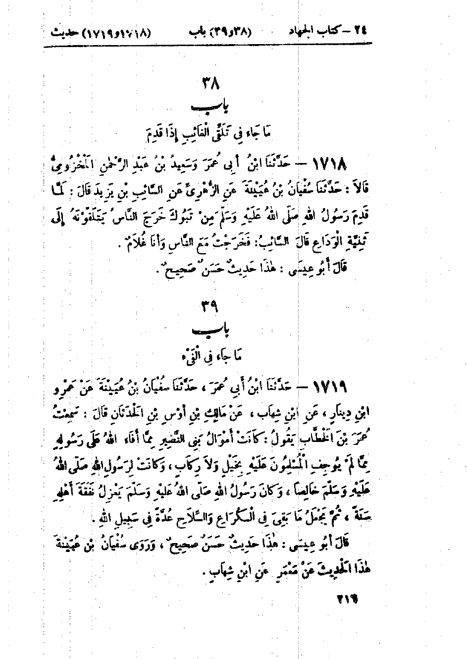 1718 - حَدَّثَنَا ابْنُ أَبِي عُمَرَ، وَسَعِيدُ بْنُ عَبْدِ الرَّحْمَنِ المَخْزُومِيُّ، قَالَا: حَدَّثَنَا سُفْيَانُ بْنُ عُيَيْنَةَ، عَنْ الزُّهْرِيِّ، عَنْ السَّائِبِ بْنِ يَزِيدَ قَالَ: «§لَمَّا قَدِمَ رَسُولُ اللَّهِ صَلَّى اللَّهُ عَلَيْهِ وَسَلَّمَ مِنْ تَبُوكَ خَرَجَ النَّاسُ يَتَلَقَّوْنَهُ إِلَى ثَنِيَّةِ الوَدَاعِ»، قَالَ السَّائِبُ: فَخَرَجْتُ مَعَ النَّاسِ وَأَنَا غُلَامٌ،: هَذَا حَدِيثٌ حَسَنٌ صَحِيحٌ