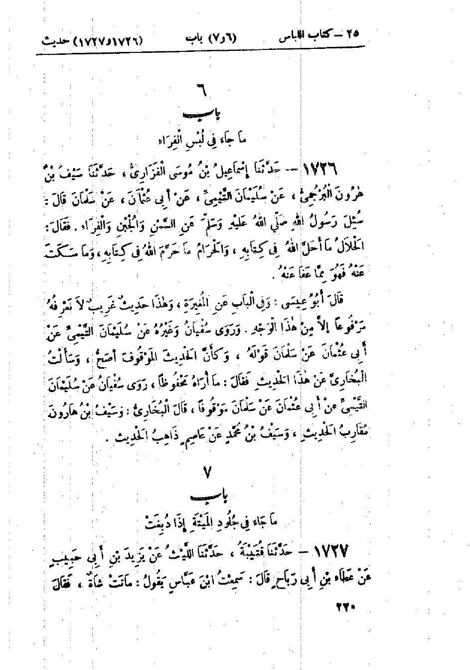 1726 - حَدَّثَنَا إِسْمَاعِيلُ بْنُ مُوسَى الفَزَارِيُّ قَالَ: حَدَّثَنَا سَيْفُ بْنُ هَارُونَ البُرْجُمِيُّ، عَنْ سُلَيْمَانَ التَّيْمِيِّ، عَنْ أَبِي عُثْمَانَ، عَنْ سَلْمَانَ قَالَ: سُئِلَ رَسُولُ اللَّهِ صَلَّى اللَّهُ عَلَيْهِ وَسَلَّمَ عَنِ السَّمْنِ وَالجُبْنِ وَالفِرَاءِ، فَقَالَ: «§الحَلَالُ مَا أَحَلَّ اللَّهُ فِي كِتَابِهِ، وَالحَرَامُ مَا حَرَّمَ اللَّهُ فِي كِتَابِهِ، وَمَا سَكَتَ عَنْهُ فَهُوَ مِمَّا عَفَا عَنْهُ»: وَفِي البَاب عَنْ المُغِيرَةِ وَهَذَا حَدِيثٌ غَرِيبٌ لَا نَعْرِفُهُ مَرْفُوعًا إِلَّا مِنْ هَذَا الوَجْهِ وَرَوَى سُفْيَانُ، وَغَيْرُهُ، عَنْ سُلَيْمَانَ التَّيْمِيِّ، عَنْ أَبِي عُثْمَانَ، عَنْ سَلْمَانَ قَوْلَهُ وَكَأَنَّ الْحَدِيثَ الْمَوْقُوفَ أَصَحُّ وَسَأَلْتُ الْبُخَارِيَّ عَنْ هَذَا الْحَدِيثِ، فَقَالَ: مَا أُرَاهُ مَحْفُوظًا، رَوَى سُفْيَانُ، عَنْ سُلَيْمَانَ التَّيْمِيِّ، عَنْ أَبِي عُثْمَانَ، عَنْ سَلْمَانَ مَوْقُوفًا، قَالَ البُخَارِيُّ: وَسَيْفُ بْنُ هَارُونَ مُقَارِبُ الحَدِيثِ، وَسَيْفُ بْنُ مُحَمَّدٍ عَنْ عَاصِمٍ ذَاهِبُ الحَدِيثِ