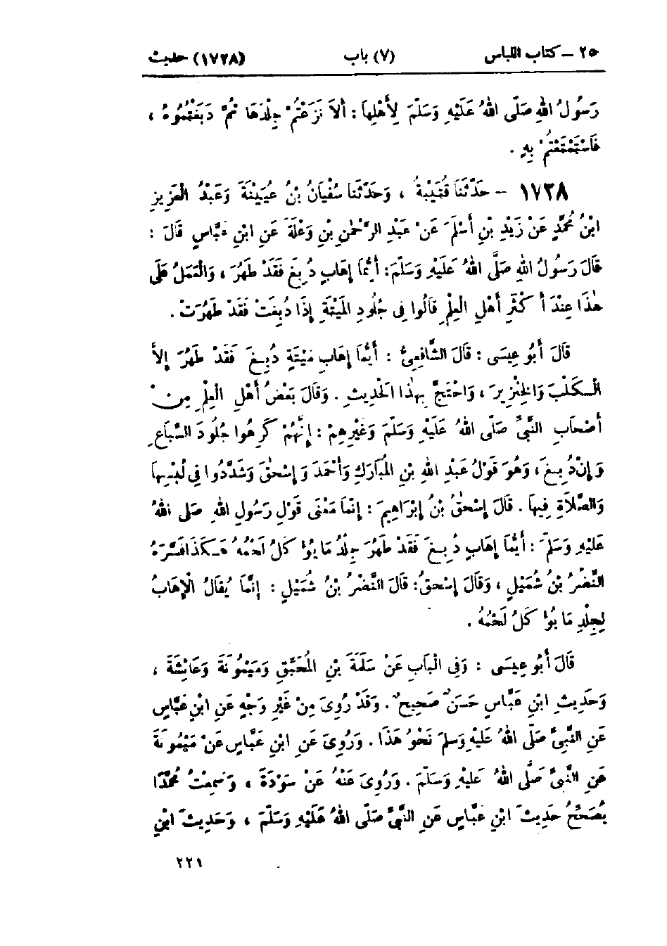 1728 - حَدَّثَنَا قُتَيْبَةُ قَالَ: حَدَّثَنَا سُفْيَانُ بْنُ عُيَيْنَةَ، وَعَبْدُ العَزِيزِ بْنُ مُحَمَّدٍ، عَنْ زَيْدِ بْنِ أَسْلَمَ، عَنْ عَبْدِ الرَّحْمَنِ بْنِ وَعْلَةَ، عَنْ ابْنِ عَبَّاسٍ قَالَ: قَالَ رَسُولُ اللَّهِ صَلَّى اللَّهُ عَلَيْهِ وَسَلَّمَ: «§أَيُّمَا إِهَابٍ دُبِغَ فَقَدْ طَهُرَ» هَذَا حَدِيثٌ حَسَنٌ صَحِيحٌ وَالعَمَلُ عَلَى هَذَا عِنْدَ أَكْثَرِ أَهْلِ العِلْمِ، قَالُوا فِي جُلُودِ المَيْتَةِ: إِذَا دُبِغَتْ فَقَدْ طَهُرَتْ، قَالَ الشَّافِعِيُّ: أَيُّمَا إِهَابِ مَيْتَةٍ دُبِغَ فَقَدْ طَهُرَ، إِلَّا الكَلْبَ وَالخِنْزِيرَ، وَاحْتَجَّ بِهَذَا الحَدِيثِ، وقَالَ بَعْضُ أَهْلِ العِلْمِ مِنْ أَصْحَابِ النَّبِيِّ صَلَّى اللَّهُ عَلَيْهِ وَسَلَّمَ وَغَيْرِهِمْ: إِنَّهُمْ كَرِهُوا جُلُودَ السِّبَاعِ وَإِنْ دُبِغَ، وَهُوَ قَوْلُ عَبْدِ اللَّهِ بْنِ المُبَارَكِ، وَأَحْمَدَ، وَإِسْحَاقَ، وَالْحُمَيْدِيِّ، وَشَدَّدُوا فِي لُبْسِهَا وَالصَّلَاةِ فِيهَا قَالَ إِسْحَاقُ بْنُ إِبْرَاهِيمَ: إِنَّمَا مَعْنَى قَوْلِ رَسُولِ اللَّهِ صَلَّى اللَّهُ عَلَيْهِ وَسَلَّمَ: «أَيُّمَا إِهَابٍ دُبِغَ فَقَدْ طَهُرَ»، جِلْدُ مَا يُؤْكَلُ لَحْمُهُ، هَكَذَا فَسَّرَهُ النَّضْرُ بْنُ شُمَيْلٍ. وقَالَ إِسْحَاقُ: قَالَ النَّضْرُ بْنُ شُمَيْلٍ: إِنَّمَا يُقَالُ: الإِهَابُ لِجِلْدِ مَا يُؤْكَلُ لَحْمُهُ