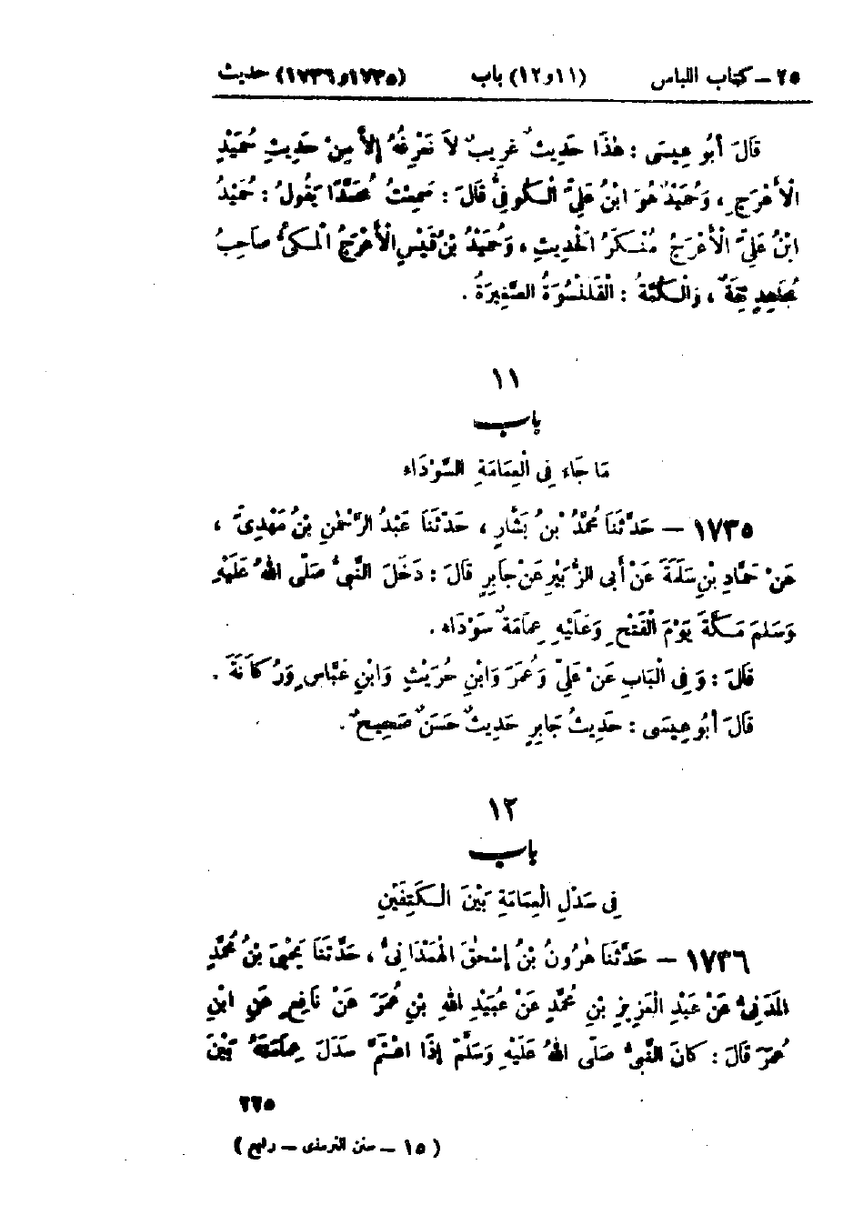 1736 - حَدَّثَنَا هَارُونُ بْنُ إِسْحَاقَ الهَمْدَانِيُّ قَالَ: حَدَّثَنَا يَحْيَى بْنُ مُحَمَّدٍ المَدَنِيُّ، عَنْ عَبْدِ العَزِيزِ بْنِ مُحَمَّدٍ، عَنْ عُبَيْدِ اللَّهِ بْنِ عُمَرَ، عَنْ نَافِعٍ، عَنْ ابْنِ عُمَرَ قَالَ: «كَانَ النَّبِيُّ صَلَّى اللَّهُ عَلَيْهِ وَسَلَّمَ §إِذَا اعْتَمَّ سَدَلَ عِمَامَتَهُ بَيْنَ -[226]- كَتِفَيْهِ» قَالَ نَافِعٌ: وَكَانَ ابْنُ عُمَرَ يَسْدِلُ عِمَامَتَهُ بَيْنَ كَتِفَيْهِ، قَالَ عُبَيْدُ اللَّهِ: وَرَأَيْتُ القَاسِمَ، وَسَالِمًا يَفْعَلَانِ ذَلِكَ: هَذَا حَدِيثٌ حَسَنٌ غَرِيبٌ. وَفِي البَاب عَنْ عَلِيٍّ. وَلَا يَصِحُّ حَدِيثُ عَلِيٍّ فِي هَذَا مِنْ قِبَلِ إِسْنَادِهِ