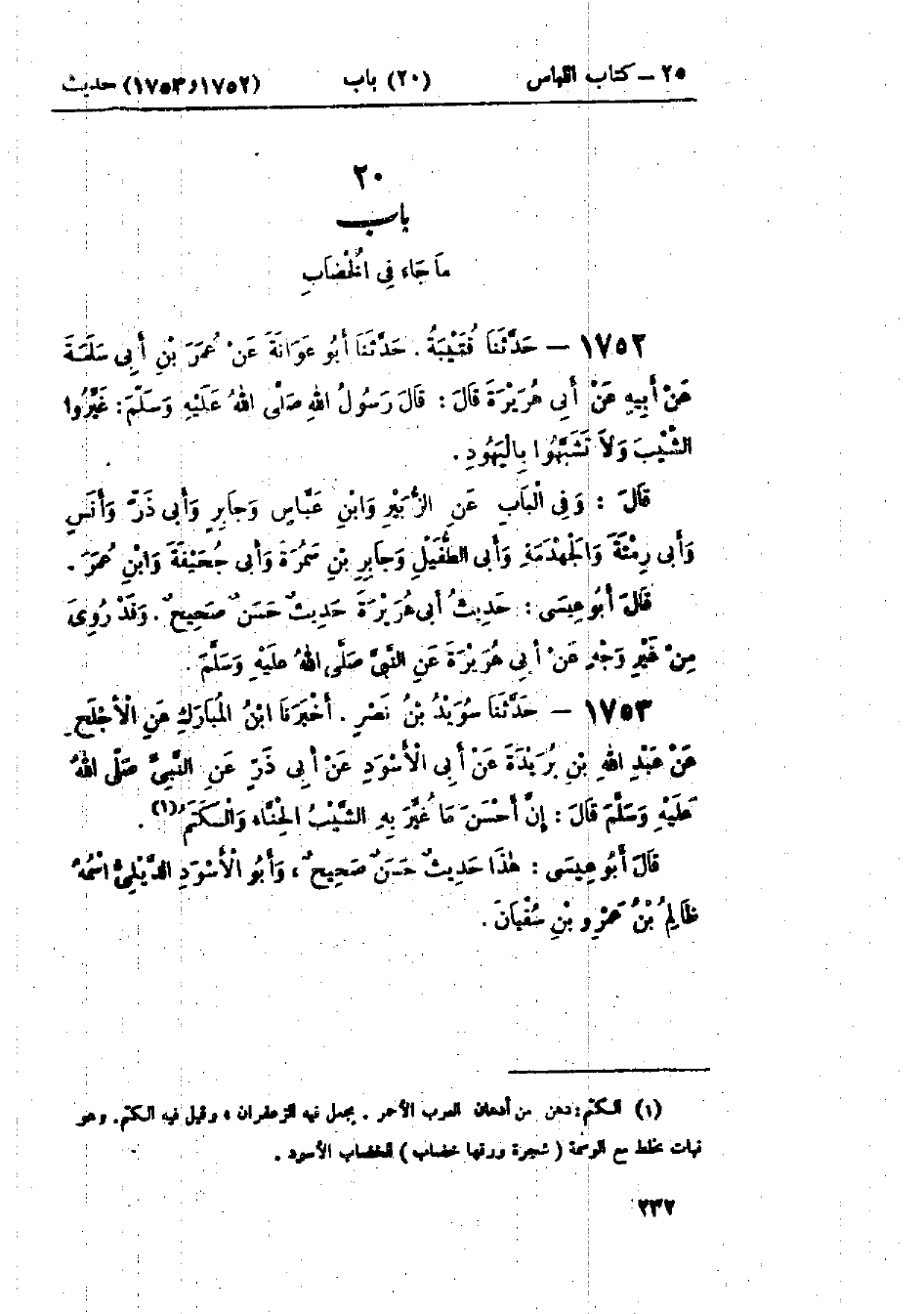 1752 - حَدَّثَنَا قُتَيْبَةُ قَالَ: حَدَّثَنَا أَبُو عَوَانَةَ، عَنْ عُمَرَ بْنِ أَبِي سَلَمَةَ، عَنْ أَبِيهِ، عَنْ أَبِي هُرَيْرَةَ قَالَ: قَالَ رَسُولُ اللَّهِ صَلَّى اللَّهُ عَلَيْهِ وَسَلَّمَ: «§غَيِّرُوا الشَّيْبَ وَلَا تَشَبَّهُوا بِاليَهُودِ» وَفِي البَاب عَنْ الزُّبَيْرِ، وَابْنِ عَبَّاسٍ، وَجَابِرٍ، وَأَبِي ذَرٍّ، وَأَنَسٍ، وَأَبِي رِمْثَةَ، وَالجَهْدَمَةِ، وَأَبِي الطُّفَيْلِ، وَجَابِرِ بْنِ سَمُرَةَ، وَأَبِي جُحَيْفَةَ، وَابْنِ عُمَرَ: حَدِيثُ أَبِي هُرَيْرَةَ حَدِيثٌ حَسَنٌ صَحِيحٌ، وَقَدْ رُوِيَ مِنْ غَيْرِ وَجْهٍ عَنْ أَبِي هُرَيْرَةَ، عَنِ النَّبِيِّ صَلَّى اللَّهُ عَلَيْهِ وَسَلَّمَ