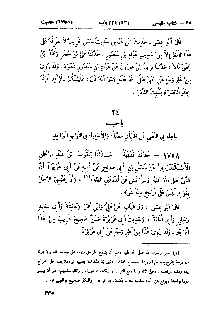 1758 - حَدَّثَنَا قُتَيْبَةُ قَالَ: حَدَّثَنَا يَعْقُوبُ بْنُ عَبْدِ الرَّحْمَنِ الإِسْكَنْدَرَانِيُّ، عَنْ سُهَيْلِ بْنِ أَبِي صَالِحٍ، عَنْ أَبِيهِ، عَنْ أَبِي هُرَيْرَةَ، " أَنَّ النَّبِيَّ صَلَّى اللَّهُ عَلَيْهِ وَسَلَّمَ §نَهَى عَنْ لِبْسَتَيْنِ: الصَّمَّاءِ، وَأَنْ يَحْتَبِيَ الرَّجُلُ بِثَوْبِهِ لَيْسَ عَلَى فَرْجِهِ مِنْهُ شَيْءٌ ": وَفِي البَاب عَنْ عَلِيٍّ، وَابْنِ عُمَرَ، وَعَائِشَةَ، وَأَبِي سَعِيدٍ، وَجَابِرٍ، وَأَبِي أُمَامَةَ وَحَدِيثُ أَبِي هُرَيْرَةَ حَسَنٌ صَحِيحٌ، وَقَدْ رُوِيَ هَذَا مِنْ غَيْرِ وَجْهٍ، عَنْ أَبِي هُرَيْرَةَ