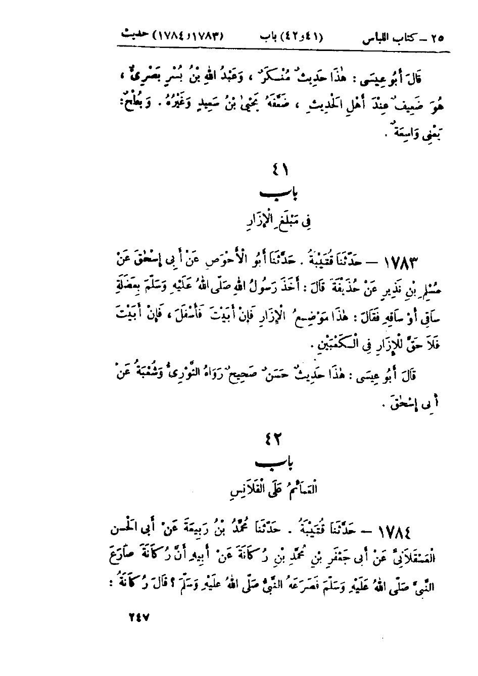 1783 - حَدَّثَنَا قُتَيْبَةُ قَالَ: حَدَّثَنَا أَبُو الأَحْوَصِ، عَنْ أَبِي إِسْحَاقَ، عَنْ مُسْلِمِ بْنِ نُذَيْرٍ، عَنْ حُذَيْفَةَ قَالَ: أَخَذَ رَسُولُ اللَّهِ صَلَّى اللَّهُ عَلَيْهِ وَسَلَّمَ بِعَضَلَةِ سَاقِي، أَوْ سَاقِهِ، فَقَالَ: «§هَذَا مَوْضِعُ الإِزَارِ، فَإِنْ أَبَيْتَ فَأَسْفَلَ، فَإِنْ أَبَيْتَ فَلَا حَقَّ لِلإِزَارِ فِي الكَعْبَيْنِ»: هَذَا حَدِيثٌ حَسَنٌ صَحِيحٌ رَوَاهُ الثَّوْرِيُّ، وَشُعْبَةُ، عَنْ أَبِي إِسْحَاقَ