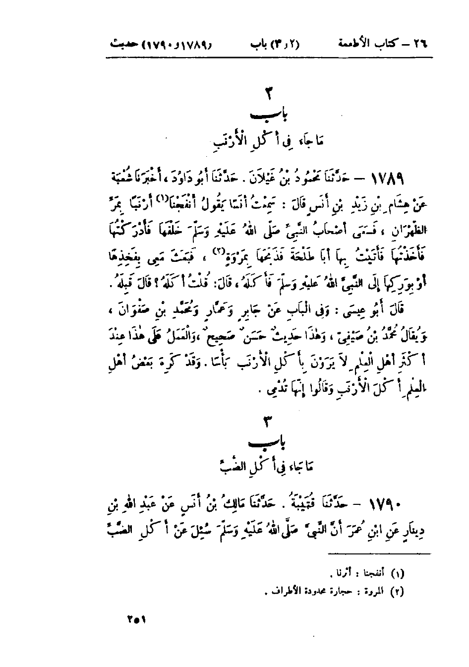 1789 - حَدَّثَنَا مَحْمُودُ بْنُ غَيْلَانَ قَالَ: حَدَّثَنَا أَبُو دَاوُدَ قَالَ: أَخْبَرَنَا شُعْبَةُ، عَنْ هِشَامِ بْنِ زَيْدِ بْنِ أَنَسٍ، قَال: سَمِعْتُ أَنَسًا يَقُولُ: §أَنْفَجْنَا أَرْنَبًا بِمَرِّ الظَّهْرَانِ، فَسَعَى أَصْحَابُ النَّبِيِّ صَلَّى اللَّهُ عَلَيْهِ وَسَلَّمَ خَلْفَهَا، فَأَدْرَكْتُهَا فَأَخَذْتُهَا، فَأَتَيْتُ بِهَا أَبَا طَلْحَةَ فَذَبَحَهَا بِمَرْوَةٍ، فَبَعَثَ مَعِي بِفَخِذِهَا أَوْ بِوَرِكِهَا إِلَى النَّبِيِّ صَلَّى اللَّهُ عَلَيْهِ وَسَلَّمَ، «فَأَكَلَهُ»، قَالَ: قُلْتُ: أَكَلَهُ؟ قَالَ: «قَبِلَهُ»: وَفِي البَاب عَنْ جَابِرٍ، وَعَمَّارٍ، وَمُحَمَّدِ بْنِ صَفْوَانَ، وَيُقَالُ: مُحَمَّدُ بْنُ صَيْفِيٍّ هَذَا حَدِيثٌ حَسَنٌ صَحِيحٌ " وَالعَمَلُ عَلَى هَذَا عِنْدَ أَكْثَرِ أَهْلِ العِلْمِ: لَا يَرَوْنَ بِأَكْلِ الأَرْنَبِ بَأْسًا «،» وَقَدْ كَرِهَ بَعْضُ أَهْلِ العِلْمِ أَكْلَ الأَرْنَبِ، وَقَالُوا: إِنَّهَا تُدْمِي "