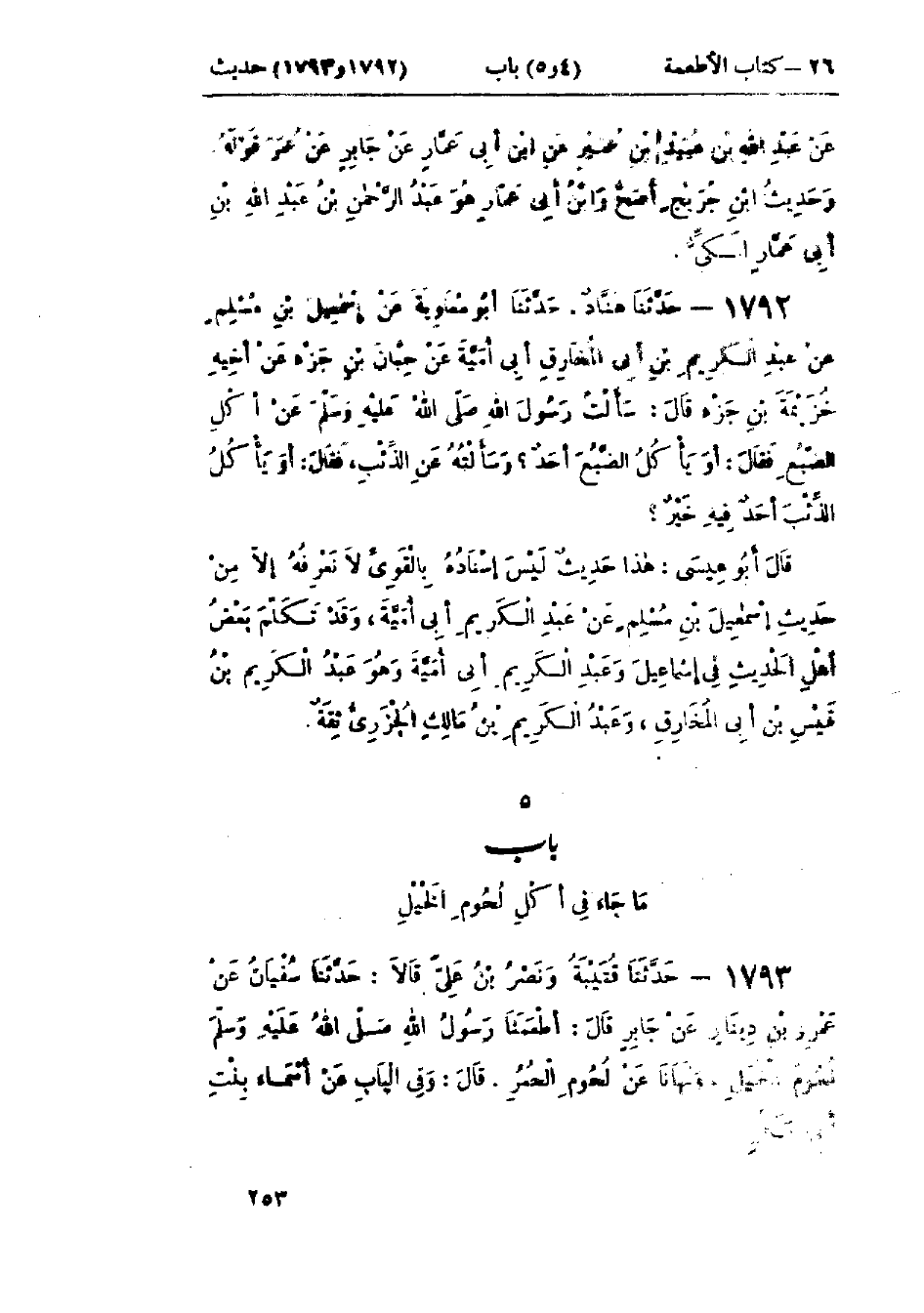 1792 - حَدَّثَنَا هَنَّادٌ قَالَ: حَدَّثَنَا أَبُو مُعَاوِيَةَ، عَنْ إِسْمَاعِيلَ بْنِ مُسْلِمٍ، عَنْ عَبْدِ الكَرِيمِ بْنِ أَبِي المُخَارِقِ أَبِي أُمَيَّةَ، عَنْ حِبَّانَ بْنِ جَزْءٍ، عَنْ أَخِيهِ خُزَيْمَةَ بْنِ جَزْءٍ قَالَ: سَأَلْتُ رَسُولَ اللَّهِ صَلَّى اللَّهُ عَلَيْهِ وَسَلَّمَ عَنْ أَكْلِ الضَّبُعِ، فَقَالَ: «§أَوَ يَأْكُلُ الضَّبُعَ أَحَدٌ؟»، وَسَأَلْتُهُ عَنِ الذِّئْبِ؟ فَقَالَ: «أَوَيَأْكُلُ الذِّئْبَ أَحَدٌ فِيهِ خَيْرٌ؟»: هَذَا حَدِيثٌ لَيْسَ إِسْنَادُهُ بِالقَوِيِّ لَا نَعْرِفُهُ إِلَّا مِنْ حَدِيثِ إِسْمَاعِيلَ بْنِ مُسْلِمٍ، عَنْ عَبْدِ الكَرِيمِ أَبِي أُمَيَّةَ، وَقَدْ تَكَلَّمَ بَعْضُ أَهْلِ الحَدِيثِ فِي إِسْمَاعِيلَ، وَعَبْدِ الكَرِيمِ أَبِي أُمَيَّةَ وَهُوَ عَبْدُ الكَرِيمِ بْنُ قَيْسِ بْنِ أَبِي المُخَارِقِ، وَعَبْدُ الكَرِيمِ بْنُ مَالِكٍ الجَزَرِيُّ ثِقَةٌ