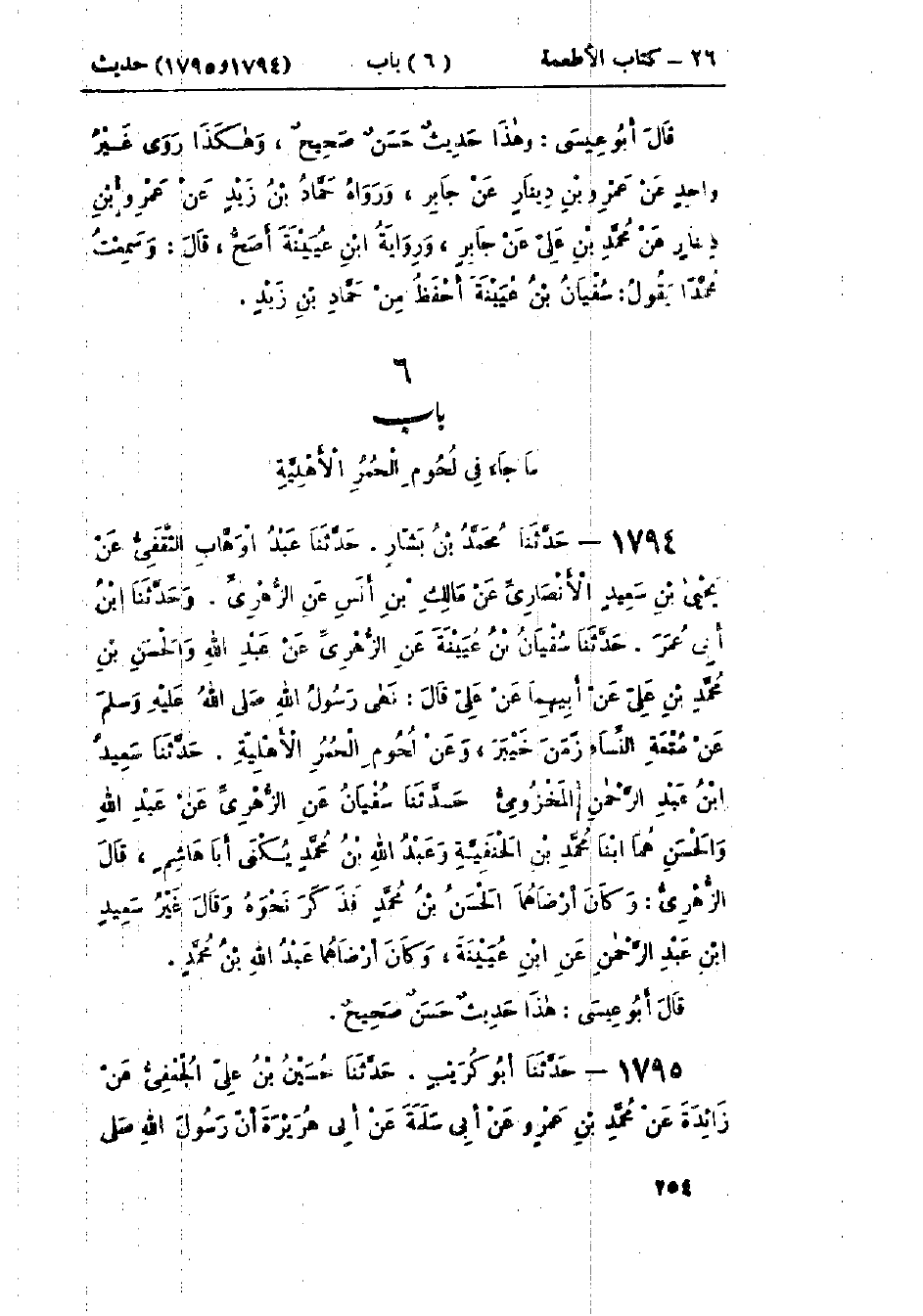 1794 - حَدَّثَنَا مُحَمَّدُ بْنُ بَشَّارٍ قَالَ: حَدَّثَنَا عَبْدُ الوَهَّابِ الثَّقَفِيُّ، عَنْ يَحْيَى بْنِ سَعِيدٍ الأَنْصَارِيِّ، عَنْ مَالِكِ بْنِ أَنَسٍ، عَنْ الزُّهْرِيِّ، ح وحَدَّثَنَا ابْنُ أَبِي عُمَرَ قَالَ: حَدَّثَنَا سُفْيَانُ بْنُ عُيَيْنَةَ، عَنْ الزُّهْرِيِّ، عَنْ عَبْدِ اللَّهِ، وَالحَسَنِ، ابْنَىْ مُحَمَّدِ بْنِ عَلِيٍّ، عَنْ أَبِيهِمَا، عَنْ عَلِيٍّ قَالَ: «§نَهَى رَسُولُ اللَّهِ صَلَّى اللَّهُ عَلَيْهِ وَسَلَّمَ عَنْ مُتْعَةِ النِّسَاءِ زَمَنَ خَيْبَرَ، وَعَنْ لُحُومِ الحُمُرِ الأَهْلِيَّةِ» حَدَّثَنَا سَعِيدُ بْنُ عَبْدِ الرَّحْمَنِ المَخْزُومِيُّ قَالَ: حَدَّثَنَا سُفْيَانُ، عَنِ الزُّهْرِيِّ، عَنْ عَبْدِ اللَّهِ، وَالحَسَنِ هُمَا ابْنَا مُحَمَّدِ ابْنِ الحَنَفِيَّةِ وَعَبْدُ اللَّهِ بْنُ مُحَمَّدٍ يُكْنَى أَبَا هَاشِمٍ قَالَ الزُّهْرِيُّ: وَكَانَ أَرْضَاهُمَا الحَسَنُ بْنُ مُحَمَّدٍ فَذَكَرَ نَحْوَهُ، وقَالَ غَيْرُ سَعِيدِ بْنِ عَبْدِ الرَّحْمَنِ: عَنْ ابْنِ عُيَيْنَةَ، وَكَانَ أَرْضَاهُمَا عَبْدُ اللَّهِ بْنُ مُحَمَّدٍ.: هَذَا حَدِيثٌ صَحِيحٌ