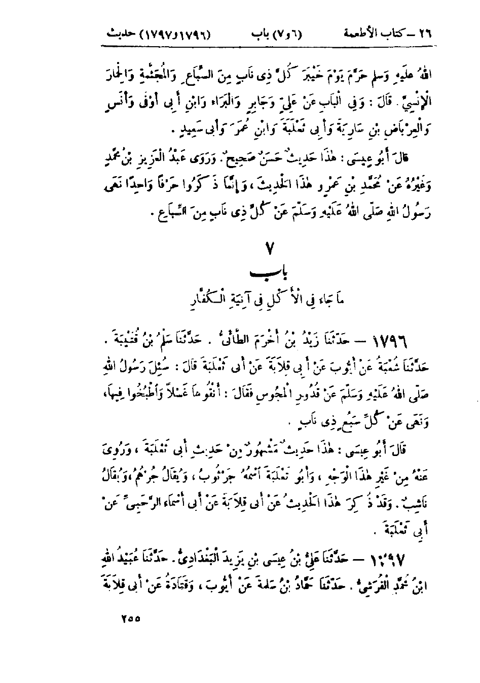1797 - حَدَّثَنَا عَلِيُّ بْنُ عِيسَى بْنِ يَزِيدَ البَغْدَادِيُّ قَالَ: حَدَّثَنَا عُبَيْدُ اللَّهِ بْنُ مُحَمَّدٍ العَيْشِيُّ قَالَ: حَدَّثَنَا حَمَّادُ بْنُ سَلَمَةَ، عَنْ أَيُّوبَ، وَقَتَادَةَ، عَنْ أَبِي قِلَابَةَ، -[256]- عَنْ أَبِي أَسْمَاءَ الرَّحَبِيِّ، عَنْ أَبِي ثَعْلَبَةَ الخُشَنِيِّ، أَنَّهُ قَالَ: يَا رَسُولَ اللَّهِ، إِنَّا بِأَرْضِ أَهْلِ الكِتَابِ، فَنَطْبُخُ فِي قُدُورِهِمْ، وَنَشْرَبُ فِي آنِيَتِهِمْ، فَقَالَ رَسُولُ اللَّهِ صَلَّى اللَّهُ عَلَيْهِ وَسَلَّمَ: «§إِنْ لَمْ تَجِدُوا غَيْرَهَا فَارْحَضُوهَا بِالمَاءِ»