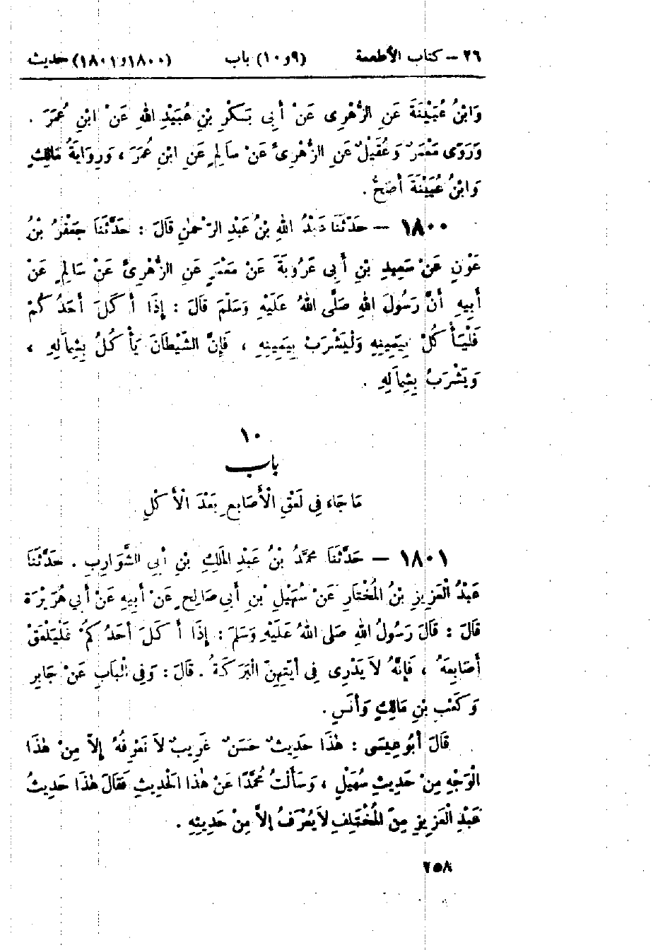 1801 - حَدَّثَنَا مُحَمَّدُ بْنُ عَبْدِ المَلِكِ بْنِ أَبِي الشَّوَارِبِ قَالَ: حَدَّثَنَا عَبْدُ العَزِيزِ بْنُ المُخْتَارِ، عَنْ سُهَيْلِ بْنِ أَبِي صَالِحٍ، عَنْ أَبِيهِ، عَنْ أَبِي هُرَيْرَةَ قَالَ: قَالَ رَسُولُ اللَّهِ صَلَّى اللَّهُ عَلَيْهِ وَسَلَّمَ: «§إِذَا أَكَلَ أَحَدُكُمْ فَلْيَلْعَقْ أَصَابِعَهُ، فَإِنَّهُ لَا يَدْرِي فِي أَيَّتِهِنَّ البَرَكَةُ» وَفِي البَاب عَنْ جَابِرٍ، وَكَعْبِ بْنِ مَالِكٍ، وَأَنَسٍ: هَذَا حَدِيثٌ حَسَنٌ غَرِيبٌ لَا نَعْرِفُهُ إِلَّا مِنْ هَذَا الوَجْهِ مِنْ حَدِيثِ سُهَيْلٍ. وَسَأَلْتُ مُحَمَّدًا عَنْ هَذَا الحَدِيثِ، فَقَالَ: «هَذَا حَدِيثُ عَبْدِ الْعَزِيزِ مِنَ الْمُخْتَلِفِ لَا يُعْرَفُ إِلَّا مِنْ حَدِيثِهِ»