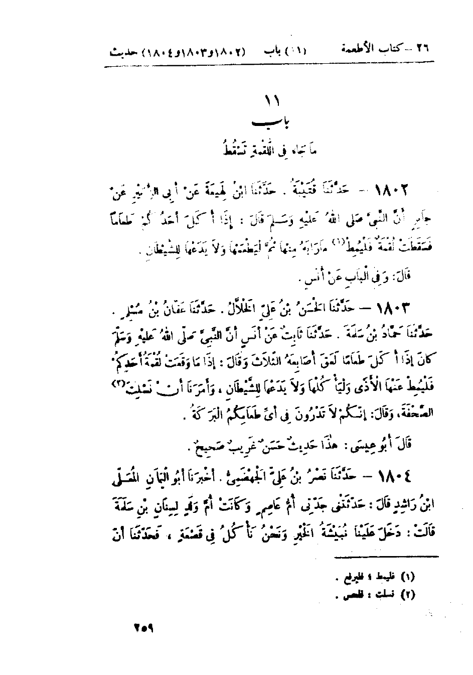 1802 - حَدَّثَنَا قُتَيْبَةُ قَالَ: حَدَّثَنَا ابْنُ لَهِيعَةَ، عَنْ أَبِي الزُّبَيْرِ، عَنْ جَابِرٍ، أَنَّ النَّبِيَّ صَلَّى اللَّهُ عَلَيْهِ وَسَلَّمَ قَالَ: «§إِذَا أَكَلَ أَحَدُكُمْ طَعَامًا فَسَقَطَتْ لُقْمَتُهُ فَلْيُمِطْ مَا رَابَهُ مِنْهَا، ثُمَّ لْيَطْعَمْهَا وَلَا يَدَعْهَا لِلشَّيْطَانِ» وَفِي البَاب عَنْ أَنَسٍ
