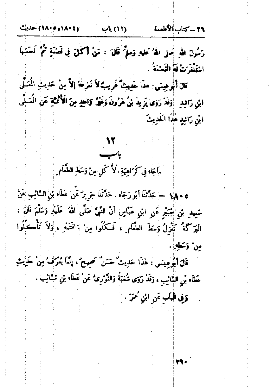 1805 - حَدَّثَنَا أَبُو رَجَاءٍ قَالَ: حَدَّثَنَا جَرِيرٌ، عَنْ عَطَاءِ بْنِ السَّائِبِ، عَنْ سَعِيدِ بْنِ جُبَيْرٍ، عَنْ ابْنِ عَبَّاسٍ، أَنَّ النَّبِيَّ صَلَّى اللَّهُ عَلَيْهِ وَسَلَّمَ قَالَ: «§البَرَكَةُ تَنْزِلُ وَسَطَ الطَّعَامِ، فَكُلُوا مِنْ حَافَتَيْهِ، وَلَا تَأْكُلُوا مِنْ وَسَطِهِ»: هَذَا حَدِيثٌ حَسَنٌ صَحِيحٌ إِنَّمَا يُعْرَفُ مِنْ حَدِيثِ عَطَاءِ بْنِ السَّائِبِ وَقَدْ رَوَاهُ شُعْبَةُ، وَالثَّوْرِيُّ، عَنْ عَطَاءِ بْنِ السَّائِبِ وَفِي البَاب عَنْ ابْنِ عُمَرَ