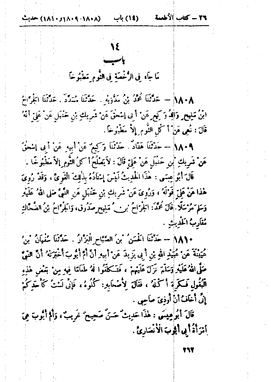 1809 - حَدَّثَنَا هَنَّادٌ قَالَ: حَدَّثَنَا وَكِيعٌ، عَنْ أَبِيهِ، عَنْ أَبِي إِسْحَاقَ، عَنْ شَرِيكِ بْنِ حَنْبَلٍ، عَنْ عَلِيٍّ قَالَ: «أَنَّهُ §كَرِهَ أَكْلَ الثُّومِ إِلَّا مَطْبُوخًا»: هَذَا الحَدِيثُ لَيْسَ إِسْنَادُهُ بِذَلِكَ القَوِيِّ، وَرُوِي عَنْ شَرِيكِ بْنِ حَنْبَلٍ، عَنِ النَّبِيِّ صَلَّى اللَّهُ عَلَيْهِ وَسَلَّمَ مُرْسَلًا قَالَ مُحَمَّدٌ: الجَرَّاحُ بْنُ مَلِيحٍ صَدُوقٌ، وَالجَرَّاحُ بْنُ الضَّحَّاكِ مُقَارِبُ الحَدِيثِ