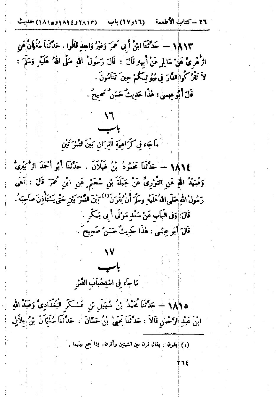 1814 - حَدَّثَنَا مَحْمُودُ بْنُ غَيْلَانَ قَالَ: حَدَّثَنَا أَبُو أَحْمَدَ الزُّبَيْرِيُّ، وَعُبَيْدُ اللَّهِ، عَنْ الثَّوْرِيِّ، عَنْ جَبَلَةَ بْنِ سُحَيْمٍ، عَنْ ابْنِ عُمَرَ قَالَ: «§نَهَى رَسُولُ اللَّهِ صَلَّى اللَّهُ عَلَيْهِ وَسَلَّمَ أَنْ يُقْرَنَ بَيْنَ التَّمْرَتَيْنِ حَتَّى يَسْتَأْذِنَ صَاحِبَهُ» وَفِي البَاب عَنْ سَعْدٍ مَوْلَى أَبِي بَكْرٍ: هَذَا حَدِيثٌ حَسَنٌ صَحِيحٌ