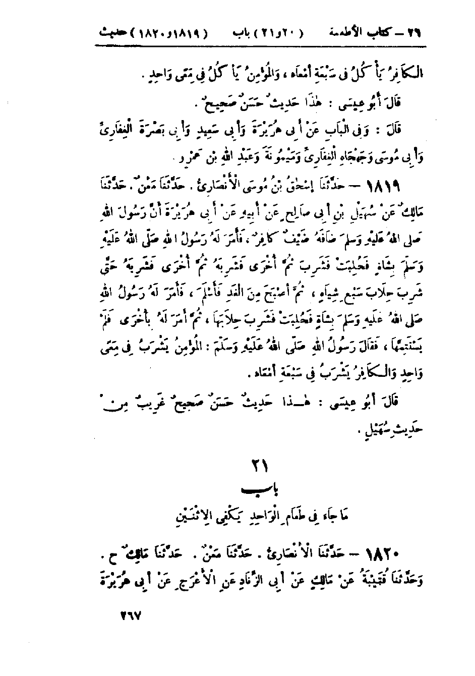 1819 - حَدَّثَنَا إِسْحَاقُ بْنُ مُوسَى الأَنْصَارِيُّ قَالَ: حَدَّثَنَا مَعْنٌ قَالَ: حَدَّثَنَا مَالِكٌ، عَنْ سُهَيْلِ بْنِ أَبِي صَالِحٍ، عَنْ أَبِيهِ، عَنْ أَبِي هُرَيْرَةَ، أَنَّ رَسُولَ اللَّهِ صَلَّى اللَّهُ عَلَيْهِ وَسَلَّمَ ضَافَهُ ضَيْفٌ كَافِرٌ، فَأَمَرَ لَهُ رَسُولُ اللَّهِ صَلَّى اللَّهُ عَلَيْهِ وَسَلَّمَ بِشَاةٍ، فَحُلِبَتْ فَشَرِبَ، ثُمَّ أُخْرَى فَشَرِبَهُ، ثُمَّ أُخْرَى فَشَرِبَهُ، حَتَّى شَرِبَ حِلَابَ سَبْعِ شِيَاهٍ، ثُمَّ أَصْبَحَ مِنَ الغَدِ، فَأَسْلَمَ، فَأَمَرَ لَهُ رَسُولُ اللَّهِ صَلَّى اللَّهُ عَلَيْهِ وَسَلَّمَ بِشَاةٍ، فَحُلِبَتْ فَشَرِبَ حِلَابَهَا، ثُمَّ أَمَرَ لَهُ بِأُخْرَى فَلَمْ يَسْتَتِمَّهَا، فَقَالَ رَسُولُ اللَّهِ صَلَّى اللَّهُ عَلَيْهِ وَسَلَّمَ: «§المُؤْمِنُ يَشْرَبُ فِي مِعًى وَاحِدٍ، وَالكَافِرُ يَشْرَبُ فِي سَبْعَةِ أَمْعَاءٍ»: هَذَا حَدِيثٌ حَسَنٌ غَرِيبٌ مِنْ حَدِيثِ سُهَيْلٍ