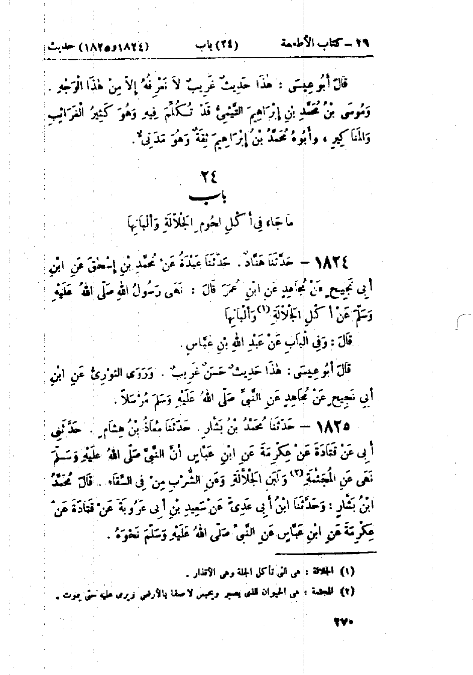 1824 - حَدَّثَنَا هَنَّادٌ قَالَ: حَدَّثَنَا عَبْدَةُ، عَنْ مُحَمَّدِ بْنِ إِسْحَاقَ، عَنْ ابْنِ أَبِي نَجِيحٍ، عَنْ مُجَاهِدٍ، عَنْ ابْنِ عُمَرَ، قَالَ: «§نَهَى رَسُولُ اللَّهِ صَلَّى اللَّهُ عَلَيْهِ وَسَلَّمَ عَنْ أَكْلِ الجَلَّالَةِ وَأَلْبَانِهَا» وَفِي البَاب عَنْ عَبْدِ اللَّهِ بْنِ عَبَّاسٍ: هَذَا حَدِيثٌ حَسَنٌ غَرِيبٌ وَرَوَاهُ الثَّوْرِيُّ، عَنْ ابْنِ أَبِي نَجِيحٍ، عَنْ مُجَاهِدٍ، عَنِ النَّبِيِّ صَلَّى اللَّهُ عَلَيْهِ وَسَلَّمَ مُرْسَلًا