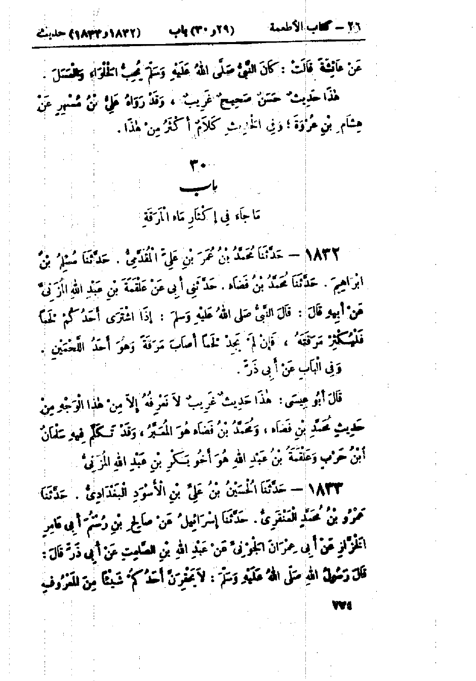 1832 - حَدَّثَنَا مُحَمَّدُ بْنُ عُمَرَ بْنِ عَلِيٍّ المُقَدَّمِيُّ قَالَ: حَدَّثَنَا مُسْلِمُ بْنُ إِبْرَاهِيمَ قَالَ: حَدَّثَنَا مُحَمَّدُ بْنُ فَضَاءٍ قَالَ: حَدَّثَنِي أَبِي، عَنْ عَلْقَمَةَ بْنِ عَبْدِ اللَّهِ المُزَنِيِّ، عَنْ أَبِيهِ قَالَ: قَالَ النَّبِيُّ صَلَّى اللَّهُ عَلَيْهِ وَسَلَّمَ: «§إِذَا اشْتَرَى أَحَدُكُمْ لَحْمًا فَلْيُكْثِرْ مَرَقَتَهُ، فَإِنْ لَمْ يَجِدْ لَحْمًا أَصَابَ مَرَقَةً، وَهُوَ أَحَدُ اللَّحْمَيْنِ» وَفِي البَابِ عَنْ أَبِي ذَرٍّ: هَذَا حَدِيثٌ غَرِيبٌ لَا نَعْرِفُهُ إِلَّا مِنْ هَذَا الوَجْهِ مِنْ حَدِيثِ مُحَمَّدِ بْنِ فَضَاءٍ، وَمُحَمَّدُ بْنُ فَضَاءٍ هُوَ المُعَبِّرُ وَقَدْ تَكَلَّمَ فِيهِ سَلْمَانُ بْنُ حَرْبٍ وَعَلْقَمَةُ بْنُ عَبْدِ اللَّهِ هُوَ أَخُو بَكْرِ بْنِ عَبْدِ اللَّهِ المُزَنِيُّ