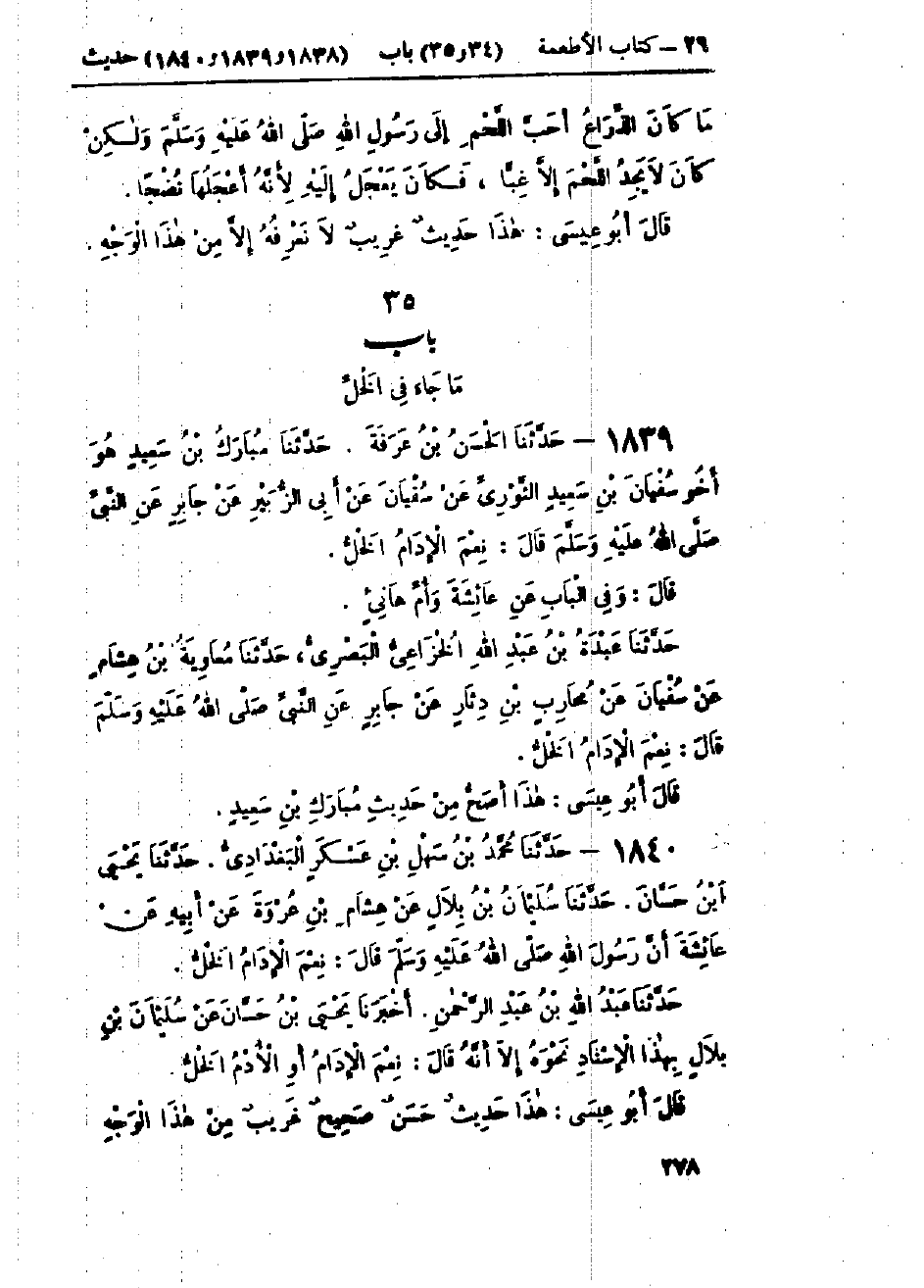 1840 - حَدَّثَنَا مُحَمَّدُ بْنُ سَهْلِ بْنِ عَسْكَرٍ البَغْدَادِيُّ قَالَ: حَدَّثَنَا يَحْيَى بْنُ حَسَّانَ قَالَ: حَدَّثَنَا سُلَيْمَانُ بْنُ بِلَالٍ، عَنْ هِشَامِ بْنِ عُرْوَةَ، عَنْ أَبِيهِ، عَنْ عَائِشَةَ، أَنَّ رَسُولَ اللَّهِ صَلَّى اللَّهُ عَلَيْهِ وَسَلَّمَ قَالَ: «§نِعْمَ الإِدَامُ الخَلُّ» حَدَّثَنَا عَبْدُ اللَّهِ بْنُ عَبْدِ الرَّحْمَنِ قَالَ: أَخْبَرَنَا يَحْيَى بْنُ حَسَّانَ، عَنْ سُلَيْمَانَ بْنِ بِلَالٍ بِهَذَا الإِسْنَادِ نَحْوَهُ إِلَّا أَنَّهُ قَالَ: «نِعْمَ الإِدَامُ، أَوِ الأُدْمُ الخَلُّ»،: هَذَا حَدِيثٌ حَسَنٌ صَحِيحٌ غَرِيبٌ مِنْ هَذَا الوَجْهِ -[279]- لَا نَعْرِفُهُ مِنْ حَدِيثِ هِشَامِ بْنِ عُرْوَةَ إِلَّا مِنْ حَدِيثِ سُلَيْمَانَ بْنِ بِلَالٍ