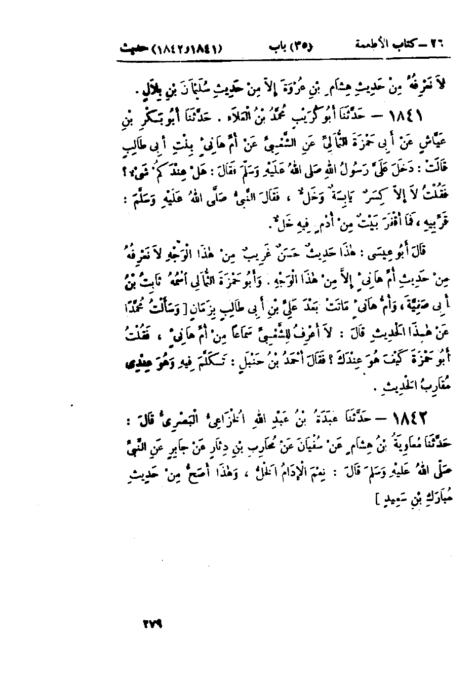 1841 - حَدَّثَنَا أَبُو كُرَيْبٍ مُحَمَّدُ بْنُ العَلَاءِ قَالَ: حَدَّثَنَا أَبُو بَكْرِ بْنُ عَيَّاشٍ، عَنْ أَبِي حَمْزَةَ الثُّمَالِيِّ، عَنْ الشَّعْبِيِّ، عَنْ أُمِّ هَانِئٍ بِنْتِ أَبِي طَالِبٍ قَالَتْ: دَخَلَ عَلَيَّ رَسُولُ اللَّهِ صَلَّى اللَّهُ عَلَيْهِ وَسَلَّمَ فَقَالَ: «هَلْ عِنْدَكُمْ شَيْءٌ؟» فَقُلْتُ: لَا، إِلَّا كِسَرٌ يَابِسَةٌ وَخَلٌّ، فَقَالَ النَّبِيُّ صَلَّى اللَّهُ عَلَيْهِ وَسَلَّمَ: «قَرِّبِيهِ، §فَمَا أَقْفَرَ بَيْتٌ مِنْ أُدْمٍ فِيهِ خَلٌّ»: هَذَا حَدِيثٌ حَسَنٌ غَرِيبٌ مِنْ هَذَا الوَجْهِ، لَا نَعْرِفُهُ مِنْ حَدِيثِ أُمِّ هَانِئٍ إِلَّا مِنْ هَذَا الوَجْهِ. وَأَبُو حَمْزَةَ الثُّمَالِيُّ اسْمُهُ ثَابِتُ بْنُ أَبِي صَفِيَّةَ، وَأُمُّ هَانِئٍ مَاتَتْ بَعْدَ عَلِيِّ بْنِ أَبِي طَالِبٍ بِزَمَانٍ، وَسَأَلْتُ مُحَمَّدًا عَنْ هَذَا الحَدِيثِ قَالَ: لَا أَعْرِفُ لِلشَّعْبِيِّ سَمَاعًا مِنْ أُمِّ هَانِئٍ، فَقُلْتُ: أَبُو حَمْزَةَ كَيْفَ هُوَ عِنْدَكَ؟ فَقَالَ: أَحْمَدُ بْنُ حَنْبَلٍ تَكَلَّمَ فِيهِ، وَهُوَ عِنْدِي مُقَارِبُ الحَدِيثِ