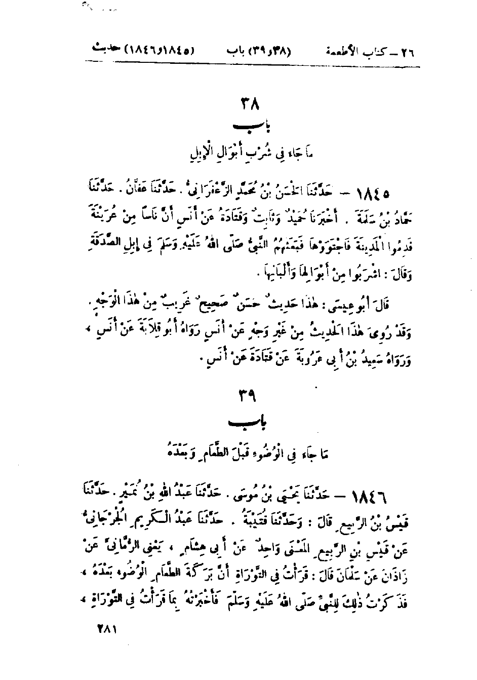 1845 - حَدَّثَنَا الحَسَنُ بْنُ مُحَمَّدٍ الزَّعْفَرَانِيُّ قَالَ: حَدَّثَنَا عَفَّانُ قَالَ: حَدَّثَنَا حَمَّادُ بْنُ سَلَمَةَ قَالَ: أَخْبَرَنَا حُمَيْدٌ، وَثَابِتٌ، وَقَتَادَةُ، عَنْ أَنَسٍ، أَنَّ نَاسًا مِنْ عُرَيْنَةَ قَدِمُوا المَدِينَةَ فَاجْتَوَوْهَا، فَبَعَثَهُمُ النَّبِيُّ صَلَّى اللَّهُ عَلَيْهِ وَسَلَّمَ فِي إِبِلِ الصَّدَقَةِ وَقَالَ: «§اشْرَبُوا مِنْ أَبْوَالِهَا وَأَلْبَانِهَا»: هَذَا حَدِيثٌ حَسَنٌ صَحِيحٌ غَرِيبٌ مِنْ هَذَا الْوَجْهِ مِنْ حَدِيثِ ثَابِتٍ، وَقَدْ رُوِيَ هَذَا الحَدِيثُ مِنْ غَيْرِ وَجْهٍ عَنْ أَنَسٍ، رَوَاهُ أَبُو قِلَابَةَ، عَنْ أَنَسٍ، وَرَوَاهُ سَعِيدُ بْنُ أَبِي عَرُوبَةَ، عَنْ قَتَادَةَ، عَنْ أَنَسٍ