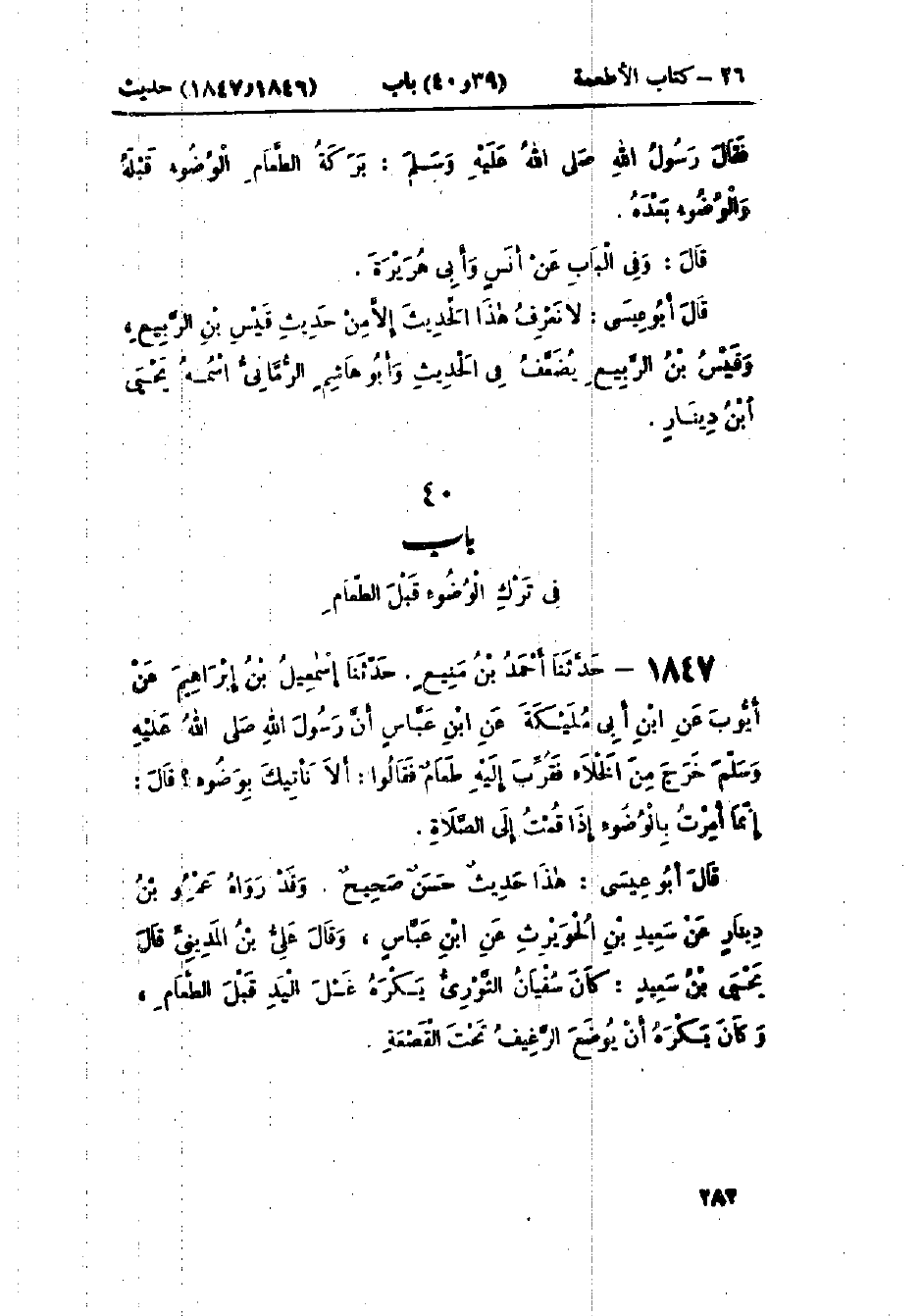 1847 - حَدَّثَنَا أَحْمَدُ بْنُ مَنِيعٍ قَالَ: حَدَّثَنَا إِسْمَاعِيلُ بْنُ إِبْرَاهِيمَ، عَنْ أَيُّوبَ، عَنْ ابْنِ أَبِي مُلَيْكَةَ، عَنْ ابْنِ عَبَّاسٍ، أَنَّ رَسُولَ اللَّهِ صَلَّى اللَّهُ عَلَيْهِ وَسَلَّمَ خَرَجَ مِنَ الخَلَاءِ فَقُرِّبَ إِلَيْهِ طَعَامٌ، فَقَالُوا: أَلَا نَأْتِيكَ بِوَضُوءٍ؟ قَالَ: «§إِنَّمَا أُمِرْتُ بِالوُضُوءِ إِذَا قُمْتُ إِلَى الصَّلَاةِ»: هَذَا حَدِيثٌ حَسَنٌ وَقَدْ رَوَاهُ عَمْرُو بْنُ دِينَارٍ، عَنْ سَعِيدِ بْنِ الحُوَيْرِثِ، عَنْ ابْنِ عَبَّاسٍ، وَقَالَ عَلِيُّ بْنُ المَدِينِيِّ: قَالَ يَحْيَى بْنُ سَعِيدٍ: كَانَ سُفْيَانُ الثَّوْرِيُّ «يَكْرَهُ غَسْلَ اليَدِ قَبْلَ الطَّعَامِ، وَكَانَ يَكْرَهُ أَنْ يُوضَعَ الرَّغِيفُ تَحْتَ القَصْعَةِ»
