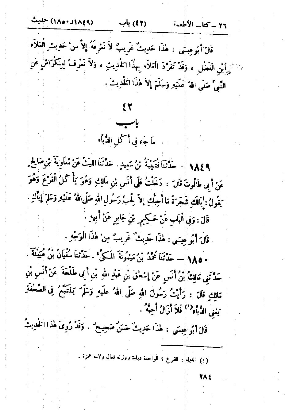 1849 - حَدَّثَنَا قُتَيْبَةُ بْنُ سَعِيدٍ قَالَ: حَدَّثَنَا اللَّيْثُ، عَنْ مُعَاوِيَةَ بْنِ صَالِحٍ، عَنْ أَبِي طَالُوتَ، قَالَ: دَخَلْتُ عَلَى أَنَسِ بْنِ مَالِكٍ وَهُوَ يَأْكُلُ القَرْعَ وَهُوَ يَقُولُ: «§يَا لَكِ شَجَرَةً مَا أُحِبُّكِ إِلَّا لِحُبِّ رَسُولِ اللَّهِ صَلَّى اللَّهُ عَلَيْهِ وَسَلَّمَ إِيَّاكِ» وَفِي البَابِ عَنْ حَكِيمِ بْنِ جَابِرٍ، عَنْ أَبِيهِ: هَذَا حَدِيثٌ غَرِيبٌ مِنْ هَذَا الوَجْهِ