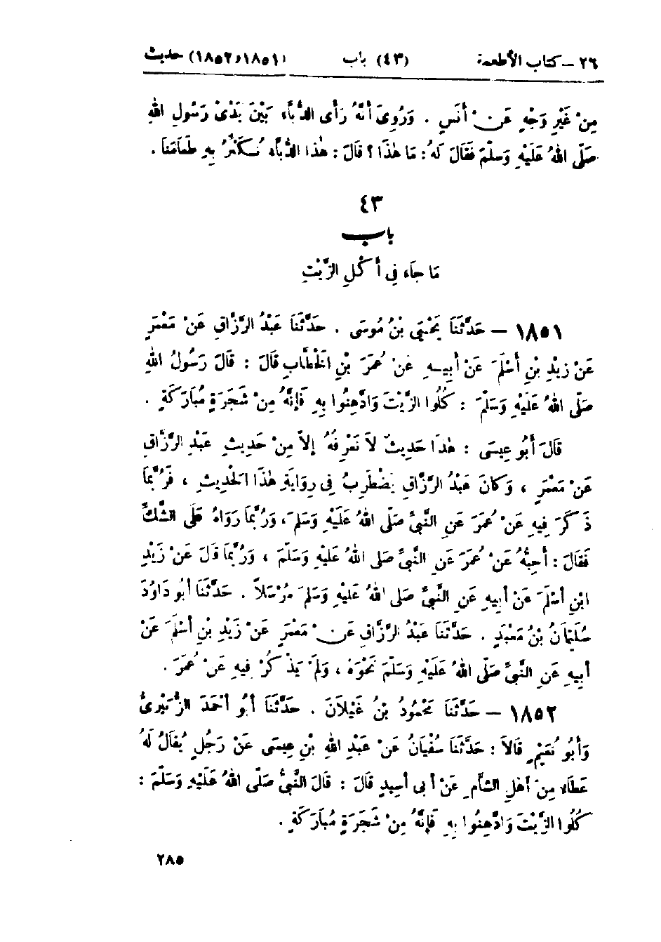 1851 - حَدَّثَنَا يَحْيَى بْنُ مُوسَى قَالَ: حَدَّثَنَا عَبْدُ الرَّزَّاقِ، عَنْ مَعْمَرٍ، عَنْ زَيْدِ بْنِ أَسْلَمَ، عَنْ أَبِيهِ، عَنْ عُمَرَ بْنِ الخَطَّابِ قَالَ: قَالَ رَسُولُ اللَّهِ صَلَّى اللَّهُ عَلَيْهِ وَسَلَّمَ: «§كُلُوا الزَّيْتَ وَادَّهِنُوا بِهِ فَإِنَّهُ مِنْ شَجَرَةٍ مُبَارَكَةٍ»: هَذَا حَدِيثٌ لَا نَعْرِفُهُ إِلَّا مِنْ حَدِيثِ عَبْدِ الرَّزَّاقِ عَنْ مَعْمَرٍ، وَكَانَ عَبْدُ الرَّزَّاقِ يَضْطَرِبُ فِي رِوَايَةِ هَذَا الحَدِيثِ، فَرُبَّمَا ذَكَرَ فِيهِ عَنْ عُمَرَ، عَنِ النَّبِيِّ صَلَّى اللَّهُ عَلَيْهِ وَسَلَّمَ، وَرُبَّمَا رَوَاهُ عَلَى الشَّكِّ فَقَالَ: أَحْسَبُهُ عَنْ عُمَرَ، عَنِ النَّبِيِّ صَلَّى اللَّهُ عَلَيْهِ وَسَلَّمَ، وَرُبَّمَا قَالَ: عَنْ زَيْدِ بْنِ أَسْلَمَ، عَنْ أَبِيهِ، عَنِ النَّبِيِّ صَلَّى اللَّهُ عَلَيْهِ وَسَلَّمَ مُرْسَلًا حَدَّثَنَا أَبُو دَاوُدَ سُلَيْمَانُ بْنُ مَعْبَدٍ قَالَ: حَدَّثَنَا عَبْدُ الرَّزَّاقِ، عَنْ مَعَمَرٍ، عَنْ زَيْدِ بْنِ أَسْلَمَ، عَنْ أَبِيهِ، عَنِ النَّبِيِّ صَلَّى اللَّهُ عَلَيْهِ وَسَلَّمَ، نَحْوَهُ وَلَمْ يَذْكُرْ فِيهِ عَنْ عُمَرَ
