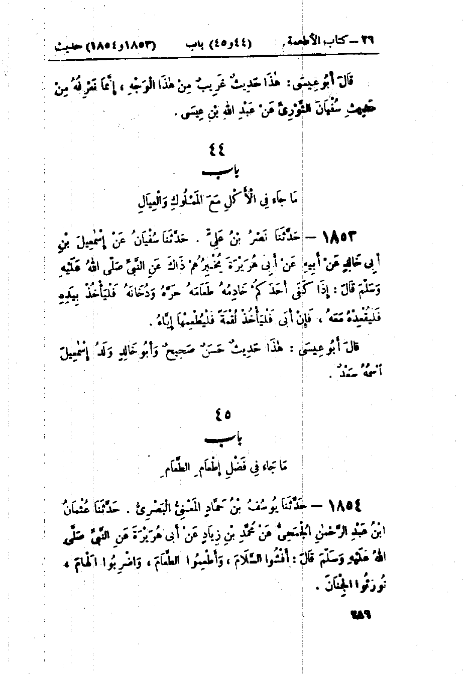 1853 - حَدَّثَنَا نَصْرُ بْنُ عَلِيٍّ قَالَ: حَدَّثَنَا سُفْيَانُ، عَنْ إِسْمَاعِيلَ بْنِ أَبِي خَالِدٍ، عَنْ أَبِيهِ، عَنْ أَبِي هُرَيْرَةَ يُخْبِرُهُمْ بِذَلِكَ، عَنِ النَّبِيِّ صَلَّى اللَّهُ عَلَيْهِ وَسَلَّمَ قَالَ: «§إِذَا كَفَى أَحَدَكُمْ خَادِمُهُ طَعَامَهُ حَرَّهُ وَدُخَانَهُ فَلْيَأْخُذْ بِيَدِهِ فَلْيُقْعِدْهُ مَعَهُ، فَإِنْ أَبَى فَلْيَأْخُذْ لُقْمَةً فَلْيُطْعِمْهَا إِيَّاهُ»: هَذَا حَدِيثٌ حَسَنٌ صَحِيحٌ وَأَبُو خَالِدٍ وَالِدُ إِسْمَاعِيلَ اسْمُهُ سَعْدٌ