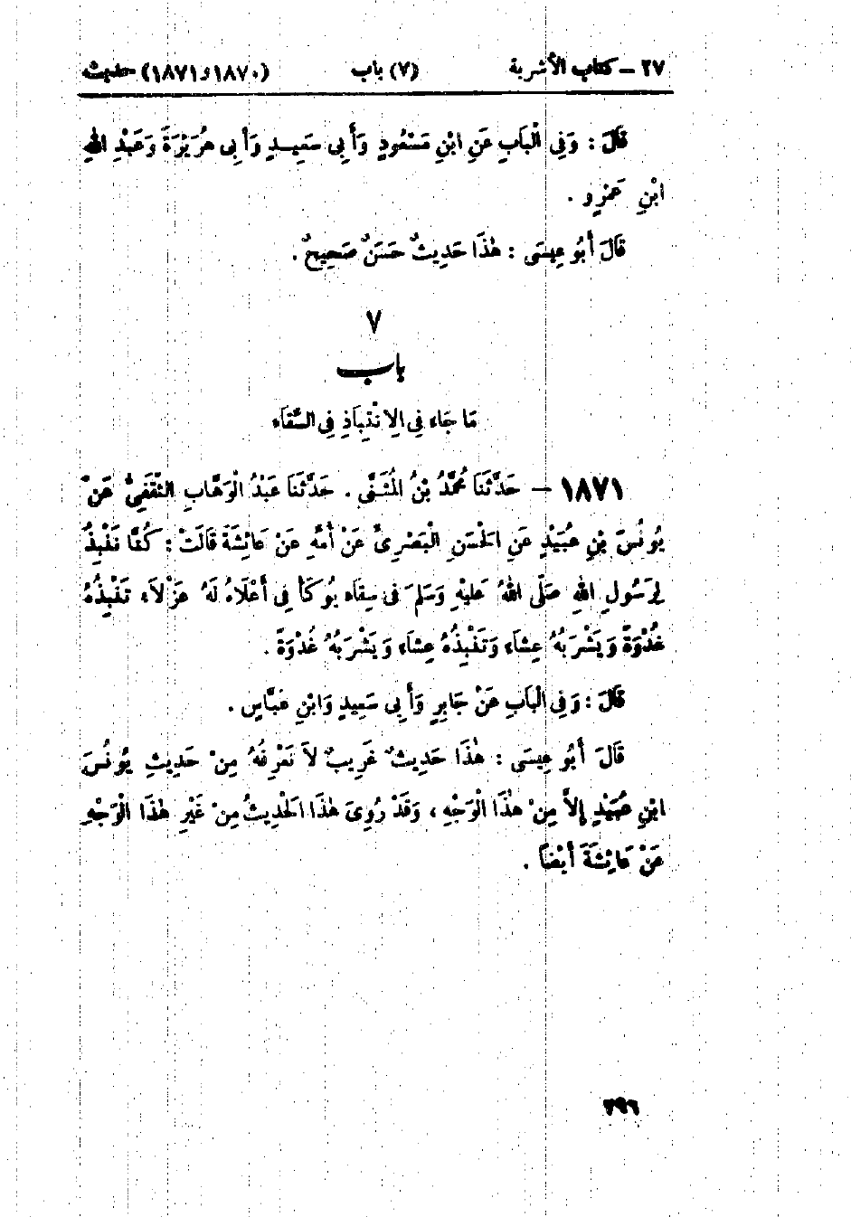 1871 - حَدَّثَنَا مُحَمَّدُ بْنُ المُثَنَّى قَالَ: حَدَّثَنَا عَبْدُ الوَهَّابِ الثَّقَفِيُّ، عَنْ يُونُسَ بْنِ عُبَيْدٍ، عَنْ الحَسَنِ البَصْرِيِّ، عَنْ أُمِّهِ، عَنْ عَائِشَةَ قَالَتْ: «§كُنَّا نَنْبِذُ لِرَسُولِ اللَّهِ صَلَّى اللَّهُ عَلَيْهِ وَسَلَّمَ فِي سِقَاءٍ، يُوكَأُ فِي أَعْلَاهُ، لَهُ عَزْلَاءُ نَنْبِذُهُ غُدْوَةً وَيَشْرَبُهُ عِشَاءً، وَنَنْبِذُهُ عِشَاءً وَيَشْرَبُهُ غُدْوَةً» وَفِي البَابِ عَنْ جَابِرٍ، وَأَبِي سَعِيدٍ، وَابْنِ عَبَّاسٍ،: هَذَا حَدِيثٌ حَسَنٌ غَرِيبٌ لَا نَعْرِفُهُ مِنْ حَدِيثِ يُونُسَ بْنِ عُبَيْدٍ إِلَّا مِنْ هَذَا الْوَجْهِ. وَقَدْ رُوِيَ هَذَا الْحَدِيثُ مِنْ غَيْرِ هَذَا الْوَجْهِ عَنْ عَائِشَةَ أَيْضًا