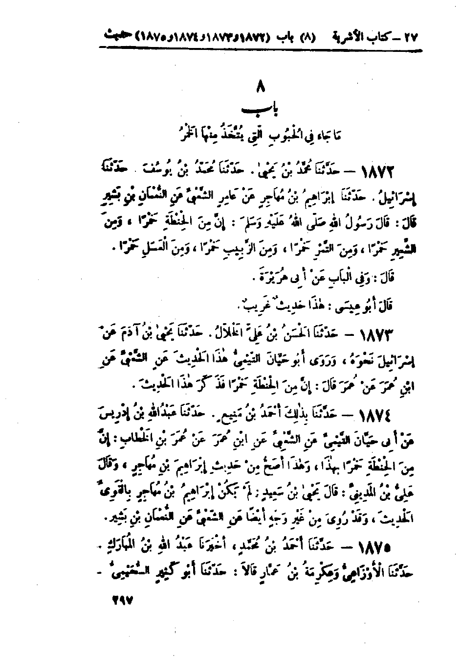 1872 - حَدَّثَنَا مُحَمَّدُ بْنُ يَحْيَى قَالَ: حَدَّثَنَا مُحَمَّدُ بْنُ يُوسُفَ قَالَ: حَدَّثَنَا إِسْرَائِيلُ قَالَ: حَدَّثَنَا إِبْرَاهِيمُ بْنُ مُهَاجِرٍ، عَنْ عَامِرٍ الشَّعْبِيِّ، عَنْ النُّعْمَانِ بْنِ بَشِيرٍ قَالَ: قَالَ رَسُولُ اللَّهِ صَلَّى اللَّهُ عَلَيْهِ وَسَلَّمَ: «إِنَّ §مِنَ الحِنْطَةِ خَمْرًا، وَمِنَ الشَّعِيرِ خَمْرًا، وَمِنَ التَّمْرِ خَمْرًا، وَمِنَ الزَّبِيبِ خَمْرًا، وَمِنَ العَسَلِ خَمْرًا» وَفِي البَابِ عَنْ أَبِي هُرَيْرَةَ: هَذَا حَدِيثٌ غَرِيبٌ