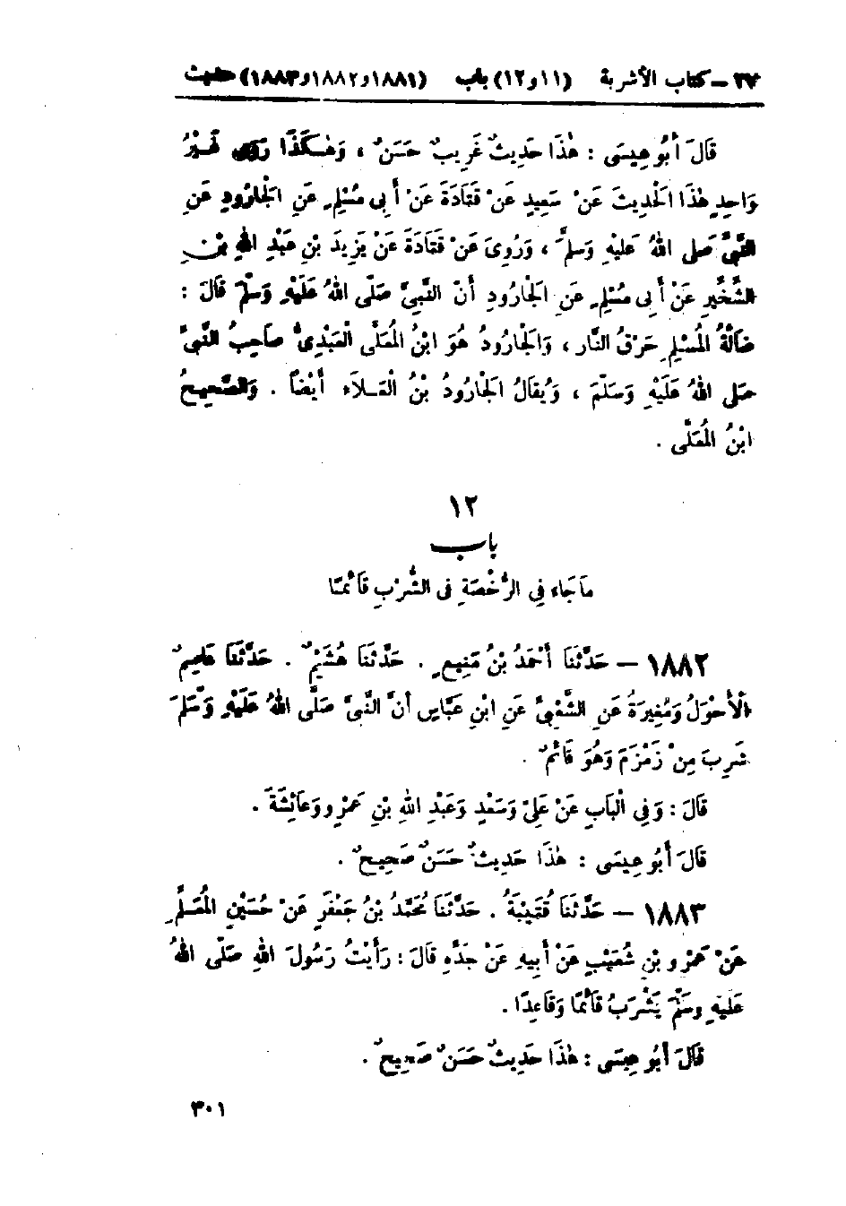 1883 - حَدَّثَنَا قُتَيْبَةُ قَالَ: حَدَّثَنَا مُحَمَّدُ بْنُ جَعْفَرٍ، عَنْ حُسَيْنٍ المُعَلِّمِ، عَنْ عَمْرِو بْنِ شُعَيْبٍ، عَنْ أَبِيهِ، عَنْ جَدِّهِ، قَالَ: «رَأَيْتُ رَسُولَ اللَّهِ صَلَّى اللَّهُ عَلَيْهِ وَسَلَّمَ §يَشْرَبُ قَائِمًا وَقَاعِدًا»: هَذَا حَدِيثٌ حَسَنٌ