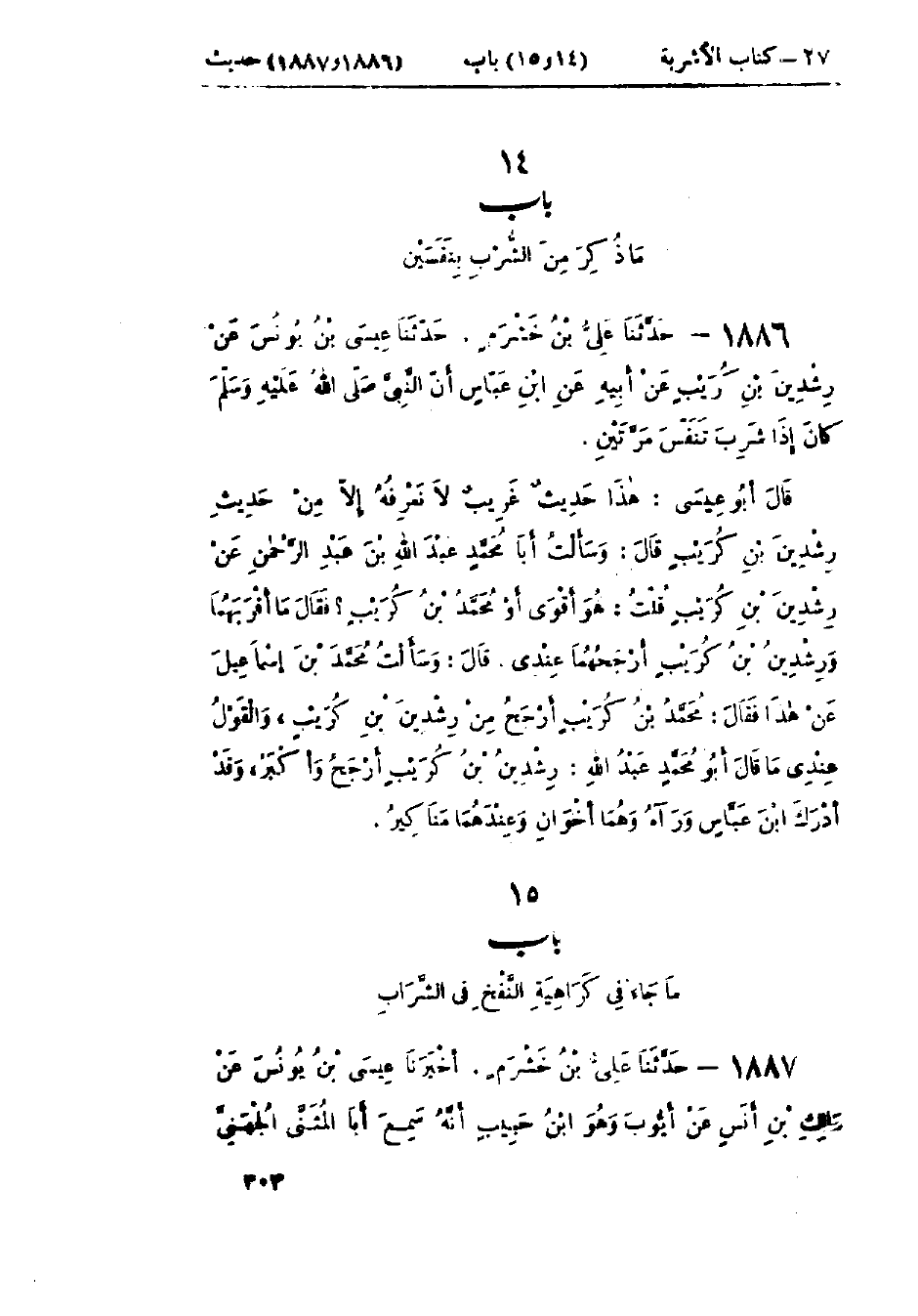 1886 - حَدَّثَنَا عَلِيُّ بْنُ خَشْرَمٍ قَالَ: حَدَّثَنَا عِيسَى بْنُ يُونُسَ، عَنْ رِشْدِينَ بْنِ كُرَيْبٍ، عَنْ أَبِيهِ، عَنْ ابْنِ عَبَّاسٍ، «أَنَّ النَّبِيَّ صَلَّى اللَّهُ عَلَيْهِ وَسَلَّمَ كَانَ §إِذَا شَرِبَ تَنَفَّسَ مَرَّتَيْنِ»: هَذَا حَدِيثٌ غَرِيبٌ لَا نَعْرِفُهُ إِلَّا مِنْ حَدِيثِ رِشْدِينَ بْنِ كُرَيْبٍ وَسَأَلْتُ أَبَا مُحَمَّدٍ عَبْدَ اللَّهِ بْنَ عَبْدِ الرَّحْمَنِ عَنْ رِشْدِينَ بْنِ كُرَيْبٍ قُلْتُ: هُوَ أَقْوَى أَوْ مُحَمَّدُ بْنُ كُرَيْبٍ؟ فَقَالَ: مَا أَقْرَبَهُمَا، وَرِشْدِينُ بْنُ كُرَيْبٍ أَرْجَحُهُمَا عِنْدِي. وَسَأَلْتُ مُحَمَّدَ بْنَ إِسْمَاعِيلَ عَنْ هَذَا، فَقَالَ: مُحَمَّدُ بْنُ كُرَيْبٍ أَرْجَحُ مِنْ رِشْدِينَ بْنِ كُرَيْبٍ، وَالقَوْلُ عِنْدِي مَا قَالَ أَبُو مُحَمَّدٍ عَبْدُ اللَّهِ، رِشْدِينُ بْنُ كُرَيْبٍ أَرْجَحُ وَأَكْبَرُ، وَقَدْ أَدْرَكَ ابْنَ عَبَّاسٍ وَرَآهُ، وَهُمَا أَخَوَانِ وَعِنْدَهُمَا مَنَاكِيرُ