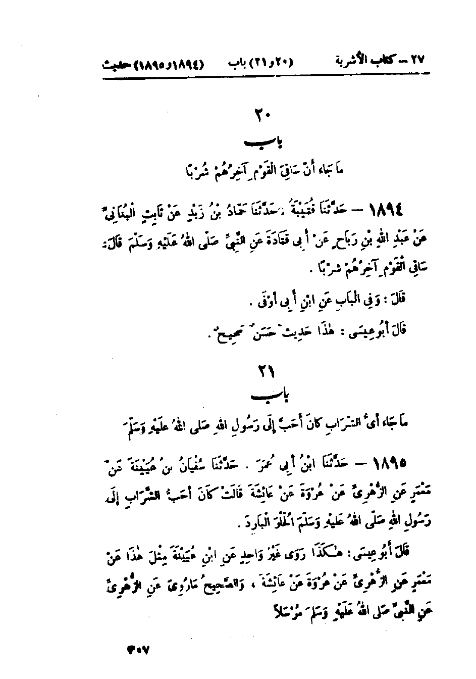 1894 - حَدَّثَنَا قُتَيْبَةُ قَالَ: حَدَّثَنَا حَمَّادُ بْنُ زَيْدٍ، عَنْ ثَابِتٍ البُنَانِيِّ، عَنْ عَبْدِ اللَّهِ بْنِ رَبَاحٍ، عَنْ أَبِي قَتَادَةَ، عَنِ النَّبِيِّ صَلَّى اللَّهُ عَلَيْهِ وَسَلَّمَ قَالَ: «§سَاقِي القَوْمِ آخِرُهُمْ شُرْبًا» وَفِي البَابِ عَنْ ابْنِ أَبِي أَوْفَى: هَذَا حَدِيثٌ حَسَنٌ صَحِيحٌ