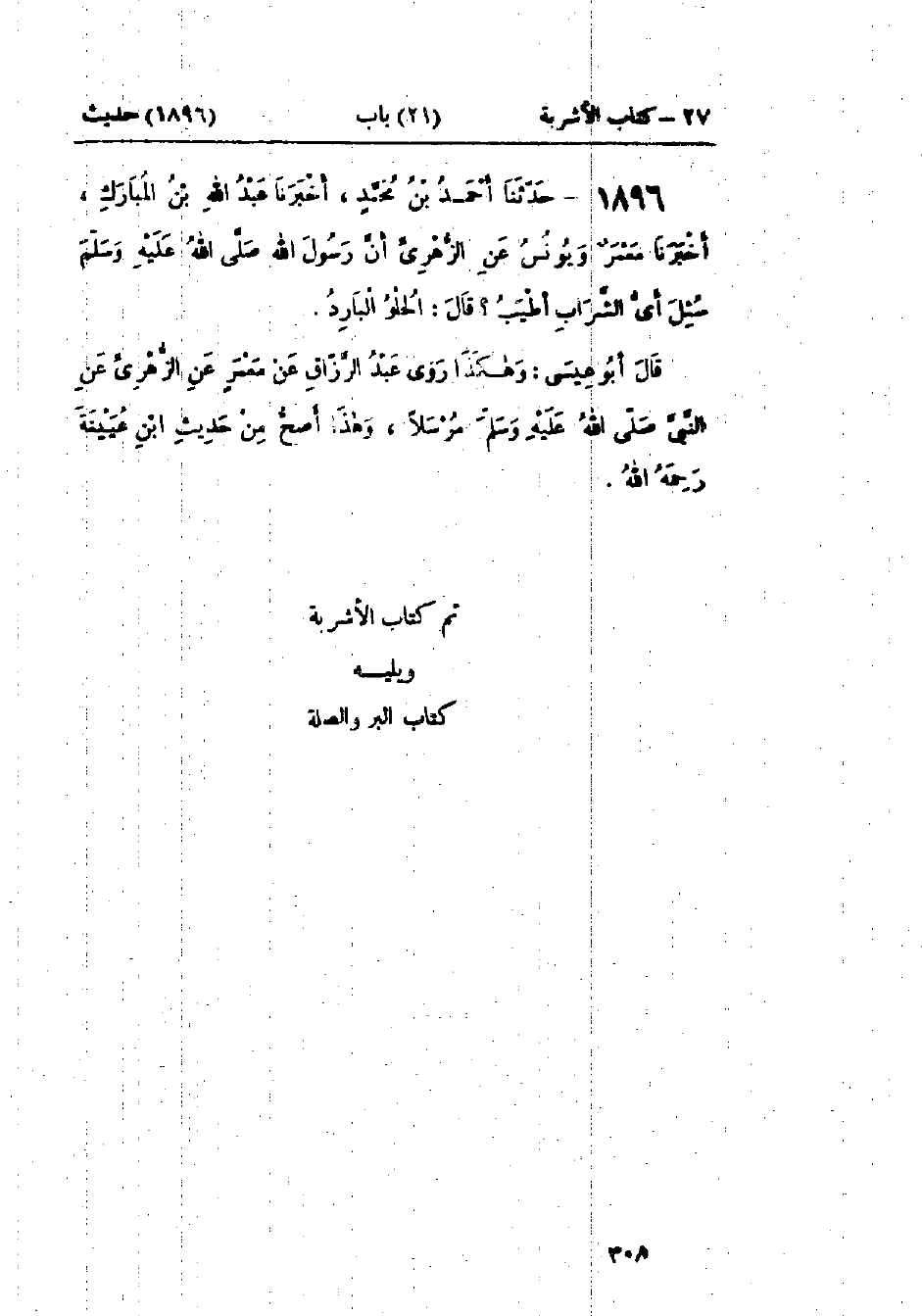 1896 - حَدَّثَنَا أَحْمَدُ بْنُ مُحَمَّدٍ قَالَ: أَخْبَرَنَا عَبْدُ اللَّهِ بْنُ المُبَارَكِ قَالَ: أَخْبَرَنَا مَعْمَرٌ، وَيُونُسُ، عَنْ الزُّهْرِيِّ، أَنَّ رَسُولَ اللَّهِ صَلَّى اللَّهُ عَلَيْهِ وَسَلَّمَ سُئِلَ §أَيُّ الشَّرَابِ أَطْيَبُ؟ قَالَ: «الحُلْوُ البَارِدُ»: وَهَكَذَا رَوَى عَبْدُ الرَّزَّاقِ، عَنْ مَعْمَرٍ، عَنِ الزُّهْرِيِّ، عَنِ النَّبِيِّ صَلَّى اللَّهُ عَلَيْهِ وَسَلَّمَ مُرْسَلًا، وَهَذَا أَصَحُّ مِنْ حَدِيثِ ابْنِ عُيَيْنَةَ