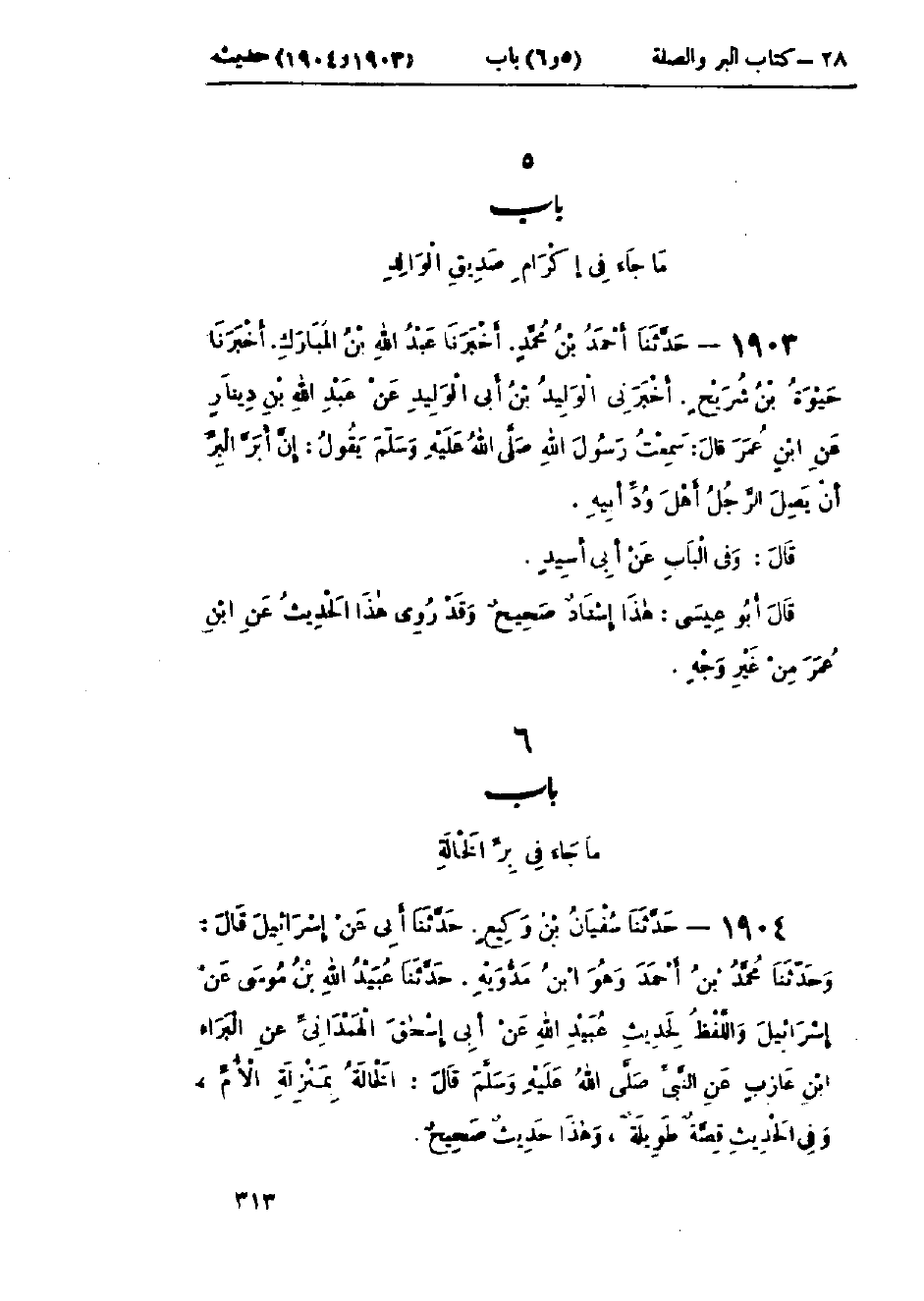 1903 - حَدَّثَنَا أَحْمَدُ بْنُ مُحَمَّدٍ قَالَ: أَخْبَرَنَا عَبْدُ اللَّهِ بْنُ المُبَارَكِ قَالَ: أَخْبَرَنَا حَيْوَةُ بْنُ شُرَيْحٍ قَالَ: أَخْبَرَنِي الوَلِيدُ بْنُ أَبِي الوَلِيدِ، عَنْ عَبْدِ اللَّهِ بْنِ دِينَارٍ، عَنْ ابْنِ عُمَرَ قَالَ: سَمِعْتُ رَسُولَ اللَّهِ صَلَّى اللَّهُ عَلَيْهِ وَسَلَّمَ يَقُولُ: «إِنَّ §أَبَرَّ البِرِّ أَنْ يَصِلَ الرَّجُلُ أَهْلَ وُدِّ أَبِيهِ» وَفِي البَابِ عَنْ أَبِي أَسِيدٍ: هَذَا إِسْنَادٌ صَحِيحٌ،، وَقَدْ رُوِيَ هَذَا الحَدِيثُ عَنْ ابْنِ عُمَرَ مِنْ غَيْرِ وَجْهٍ
