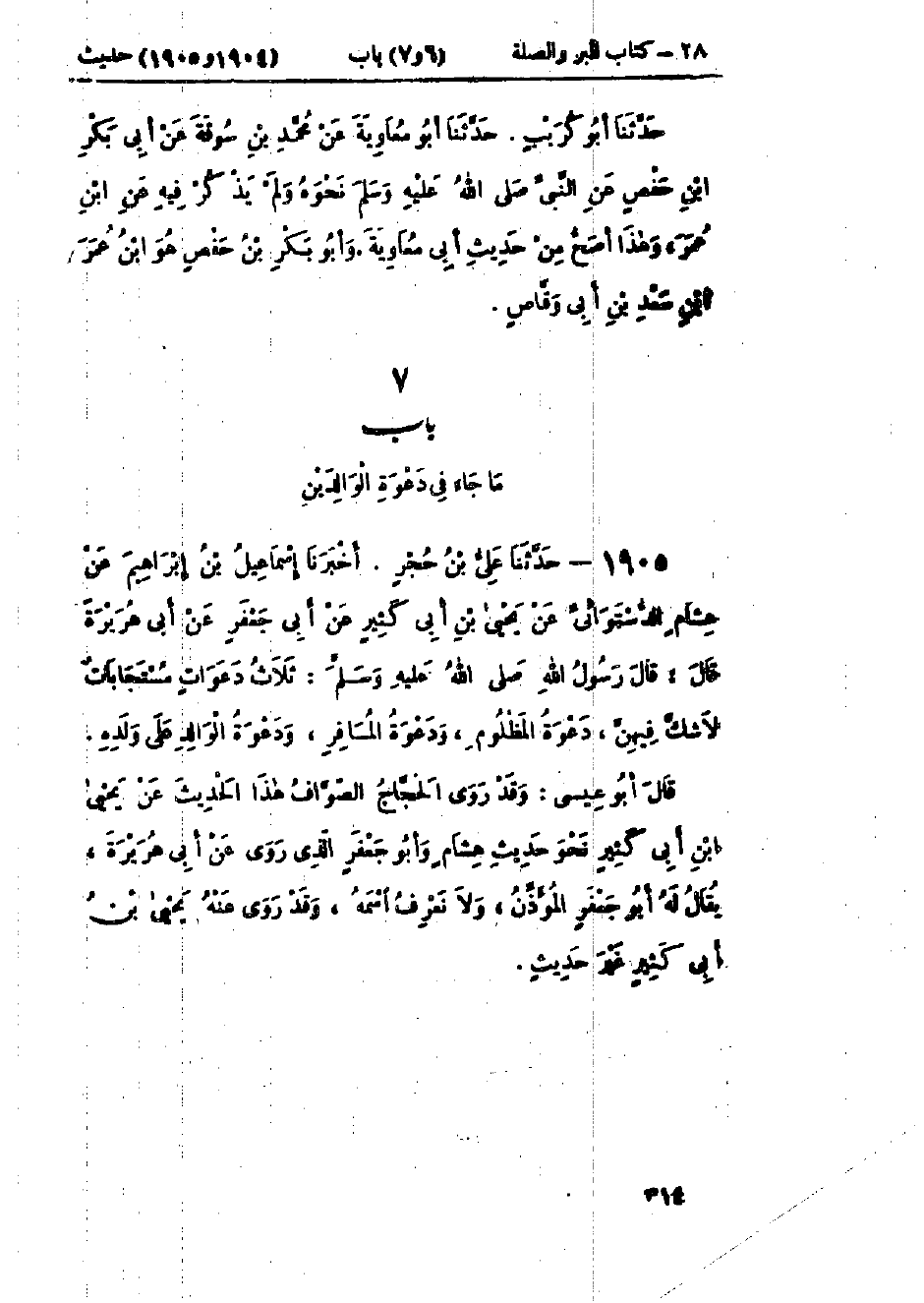1905 - حَدَّثَنَا عَلِيُّ بْنُ حُجْرٍ قَالَ: أَخْبَرَنَا إِسْمَاعِيلُ بْنُ إِبْرَاهِيمَ، عَنْ هِشَامٍ الدَّسْتُوَائِيِّ، عَنْ يَحْيَى بْنِ أَبِي كَثِيرٍ، عَنْ أَبِي جَعْفَرٍ، عَنْ أَبِي هُرَيْرَةَ قَالَ: قَالَ رَسُولُ اللَّهِ صَلَّى اللَّهُ عَلَيْهِ وَسَلَّمَ: " §ثَلَاثُ دَعَوَاتٍ مُسْتَجَابَاتٌ لَا شَكَّ فِيهِنَّ: دَعْوَةُ المَظْلُومِ، وَدَعْوَةُ المُسَافِرِ، وَدَعْوَةُ الوَالِدِ عَلَى وَلَدِهِ ". هَذَا حَدِيثٌ حَسَنٌ. وَقَدْ رَوَى الحَجَّاجُ الصَّوَّافُ هَذَا الحَدِيثَ، عَنْ يَحْيَى بْنِ أَبِي كَثِيرٍ نَحْوَ حَدِيثِ هِشَامٍ، وَأَبُو جَعْفَرٍ الَّذِي رَوَى عَنْ أَبِي هُرَيْرَةَ يُقَالُ لَهُ: أَبُو جَعْفَرٍ المُؤَذِّنُ وَلَا نَعْرِفُ اسْمَهُ، وَقَدْ رَوَى عَنْهُ يَحْيَى بْنُ أَبِي كَثِيرٍ غَيْرَ حَدِيثٍ