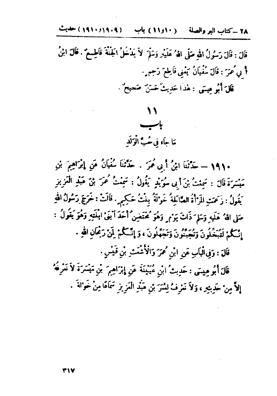1910 - حَدَّثَنَا ابْنُ أَبِي عُمَرَ قَالَ: حَدَّثَنَا سُفْيَانُ، عَنْ إِبْرَاهِيمَ بْنِ مَيْسَرَةَ، قَالَ: سَمِعْتُ ابْنَ أَبِي سُوَيْدٍ، يَقُولُ: سَمِعْتُ عُمَرَ بْنَ عَبْدِ العَزِيزِ، يَقُولُ: زَعَمَتِ المَرْأَةُ الصَّالِحَةُ خَوْلَةُ بِنْتُ حَكِيمٍ قَالَتْ: خَرَجَ رَسُولُ اللَّهِ صَلَّى اللَّهُ عَلَيْهِ وَسَلَّمَ ذَاتَ يَوْمٍ وَهُوَ مُحْتَضِنٌ أَحَدَ ابْنَيْ ابْنَتِهِ وَهُوَ يَقُولُ: «§إِنَّكُمْ لَتُبَخِّلُونَ وَتُجَبِّنُونَ وَتُجَهِّلُونَ، وَإِنَّكُمْ لَمِنْ رَيْحَانِ اللَّهِ» وَفِي البَابِ عَنْ ابْنِ عُمَرَ، وَالأَشْعَثِ بْنِ قَيْسٍ: حَدِيثُ ابْنِ عُيَيْنَةَ، عَنْ إِبْرَاهِيمَ بْنِ مَيْسَرَةَ لَا نَعْرِفُهُ إِلَّا مِنْ حَدِيثِهِ، وَلَا نَعْرِفُ لِعُمَرَ بْنِ عَبْدِ العَزِيزِ سَمَاعًا مِنْ خَوْلَةَ