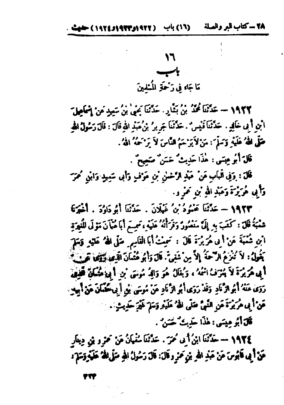 1922 - حَدَّثَنَا مُحَمَّدُ بْنُ بَشَّارٍ قَالَ: حَدَّثَنَا يَحْيَى بْنُ سَعِيدٍ، عَنْ إِسْمَاعِيلَ بْنِ أَبِي خَالِدٍ قَالَ: حَدَّثَنَا قَيْسٌ قَالَ: حَدَّثَنَا جَرِيرُ بْنُ عَبْدِ اللَّهِ قَالَ: قَالَ رَسُولُ اللَّهِ صَلَّى اللَّهُ عَلَيْهِ وَسَلَّمَ: «§مَنْ لَا يَرْحَمُ النَّاسَ لَا يَرْحَمُهُ اللَّهُ»: هَذَا حَدِيثٌ حَسَنٌ صَحِيحٌ وَفِي البَابِ عَنْ عَبْدِ الرَّحْمَنِ بْنِ عَوْفٍ، وَأَبِي سَعِيدٍ، وَابْنِ عُمَرَ، وَأَبِي هُرَيْرَةَ، وَعَبْدِ اللَّهِ بْنِ عَمْرٍو