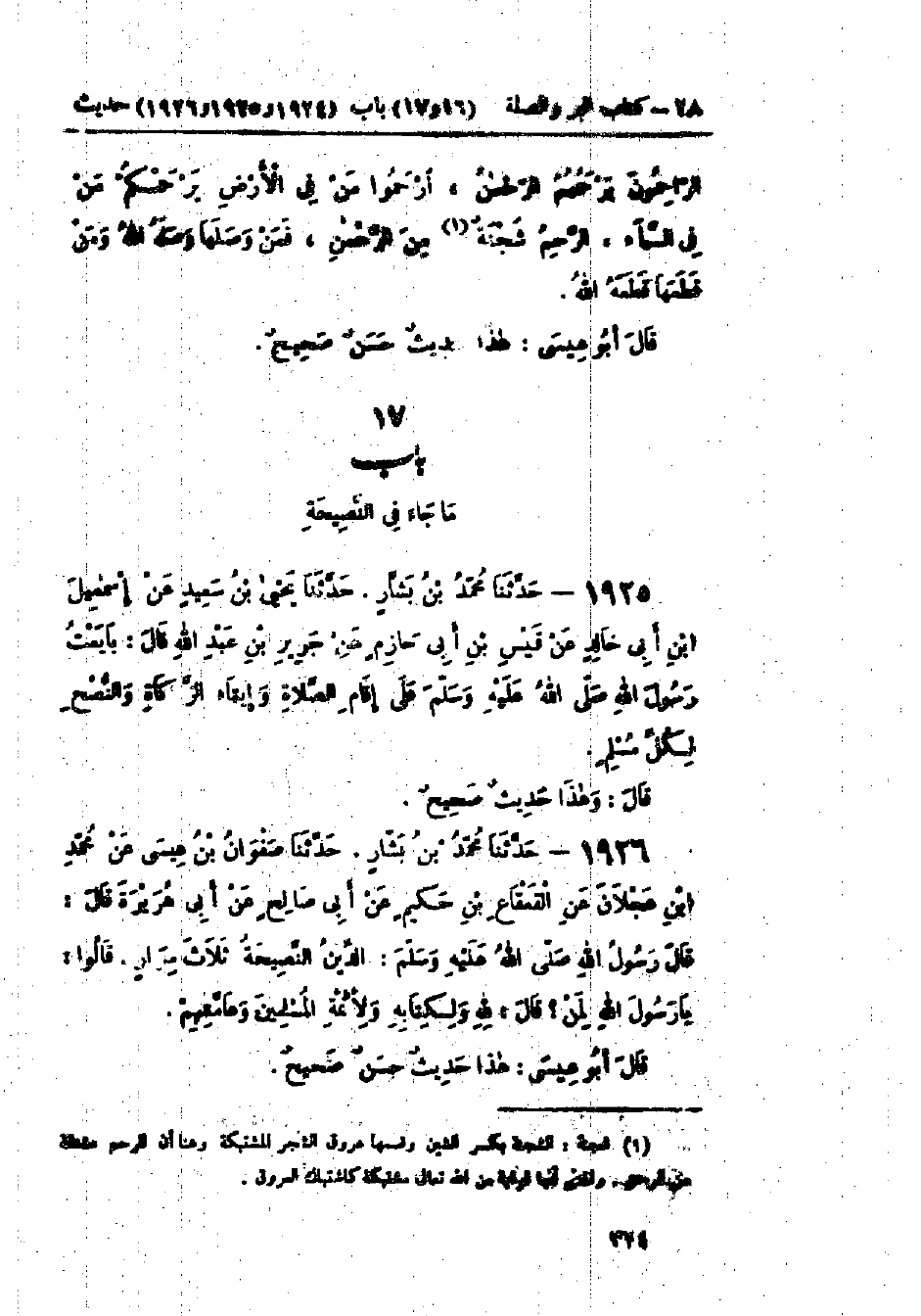1926 - حَدَّثَنَا مُحَمَّدُ بْنُ بَشَّارٍ قَالَ: حَدَّثَنَا صَفْوَانُ بْنُ عِيسَى، عَنْ مُحَمَّدِ بْنِ عَجْلَانَ، عَنْ القَعْقَاعِ بْنِ حَكِيمٍ، عَنْ أَبِي صَالِحٍ، عَنْ أَبِي هُرَيْرَةَ قَالَ: قَالَ رَسُولُ اللَّهِ صَلَّى اللَّهُ عَلَيْهِ وَسَلَّمَ: «§الدِّينُ النَّصِيحَةُ» ثَلَاثَ مِرَارٍ، قَالُوا: يَا رَسُولَ اللَّهِ لِمَنْ؟ قَالَ: «لِلَّهِ، وَلِكِتَابِهِ، وَلِأَئِمَّةِ المُسْلِمِينَ وَعَامَّتِهِمْ»: هَذَا حَدِيثٌ حَسَنٌ -[325]- وَفِي البَابِ عَنْ ابْنِ عُمَرَ، وَتَمِيمٍ الدَّارِيِّ، وَجَرِيرٍ، وَحَكِيمِ بْنِ أَبِي يَزِيدَ، عَنْ أَبِيهِ، وَثَوْبَانَ