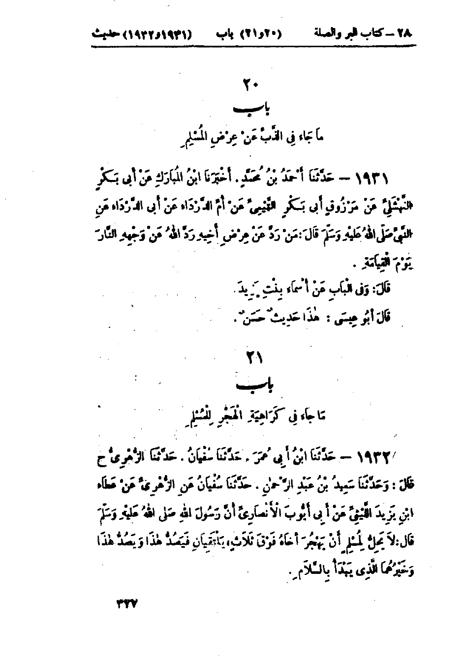 1932 - حَدَّثَنَا ابْنُ أَبِي عُمَرَ قَالَ: حَدَّثَنَا سُفْيَانُ قَالَ: حَدَّثَنَا الزُّهْرِيُّ، ح وَحَدَّثَنَا سَعِيدُ بْنُ عَبْدِ الرَّحْمَنِ قَالَ: حَدَّثَنَا سُفْيَانُ، عَنْ الزُّهْرِيِّ، عَنْ عَطَاءِ بْنِ يَزِيدَ اللَّيْثِيِّ، عَنْ أَبِي أَيُّوبَ الأَنْصَارِيِّ، أَنَّ رَسُولَ اللَّهِ صَلَّى اللَّهُ عَلَيْهِ وَسَلَّمَ قَالَ: «§لَا يَحِلُّ لِمُسْلِمٍ أَنْ يَهْجُرَ أَخَاهُ فَوْقَ ثَلَاثٍ، يَلْتَقِيَانِ فَيَصُدُّ هَذَا وَيَصُدُّ هَذَا، وَخَيْرُهُمَا الَّذِي يَبْدَأُ بِالسَّلَامِ» -[328]- وَفِي البَابِ عَنْ عَبْدِ اللَّهِ بْنِ مَسْعُودٍ، وَأَنَسٍ، وَأَبِي هُرَيْرَةَ، وَهِشَامِ بْنِ عَامِرٍ، وَأَبِي هِنْدٍ الدَّارِيِّ: هَذَا حَدِيثٌ حَسَنٌ صَحِيحٌ