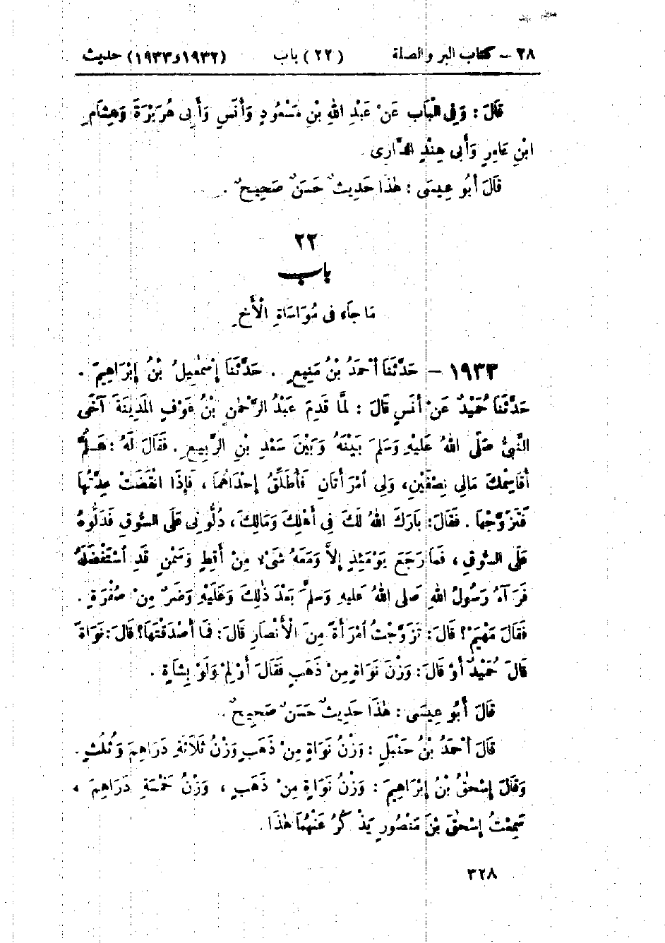 1933 - حَدَّثَنَا أَحْمَدُ بْنُ مَنِيعٍ قَالَ: حَدَّثَنَا إِسْمَاعِيلُ بْنُ إِبْرَاهِيمَ قَالَ: حَدَّثَنَا حُمَيْدٌ، عَنْ أَنَسٍ قَالَ: لَمَّا قَدِمَ عَبْدُ الرَّحْمَنِ بْنُ عَوْفٍ المَدِينَةَ آخَى النَّبِيُّ صَلَّى اللَّهُ عَلَيْهِ وَسَلَّمَ بَيْنَهُ وَبَيْنَ سَعْدِ بْنِ الرَّبِيعِ، فَقَالَ لَهُ: هَلُمَّ أُقَاسِمُكَ مَالِي نِصْفَيْنِ، وَلِيَ امْرَأَتَانِ فَأُطَلِّقُ إِحْدَاهُمَا، فَإِذَا انْقَضَتْ عِدَّتُهَا فَتَزَوَّجْهَا، فَقَالَ: بَارَكَ اللَّهُ لَكَ فِي أَهْلِكَ وَمَالِكَ، دُلُّونِي عَلَى السُّوقِ، فَدَلُّوهُ عَلَى السُّوقِ، فَمَا رَجَعَ يَوْمَئِذٍ إِلَّا وَمَعَهُ شَيْءٌ مِنْ أَقِطٍ وَسَمْنٍ قَدْ اسْتَفْضَلَهُ، فَرَآهُ رَسُولُ اللَّهِ صَلَّى اللَّهُ عَلَيْهِ وَسَلَّمَ بَعْدَ ذَلِكَ وَعَلَيْهِ وَضَرٌ مِنْ صُفْرَةٍ، فَقَالَ: «§مَهْيَمْ؟» قَالَ: تَزَوَّجْتُ امْرَأَةً مِنَ الأَنْصَارِ قَالَ: «فَمَا أَصْدَقْتَهَا؟» قَالَ: نَوَاةً ـ قَالَ حُمَيْدٌ أَوْ قَالَ: وَزْنَ نَوَاةٍ مِنْ ذَهَبٍ ـ فَقَالَ: «أَوْلِمْ وَلَوْ بِشَاةٍ»: هَذَا حَدِيثٌ حَسَنٌ صَحِيحٌ قَالَ أَحْمَدُ بْنُ حَنْبَلٍ: «وَزْنُ نَوَاةٍ مِنْ ذَهَبٍ وَزْنُ ثَلَاثَةِ دَرَاهِمَ وَثُلُثٍ» وَقَالَ إِسْحَاقُ بْنُ إِبْرَاهِيمَ: «وَزْنُ نَوَاةٍ مِنْ ذَهَبٍ، وَزْنُ خَمْسَةِ دَرَاهِمَ» سَمِعْتُ إِسْحَاقَ بْنَ مَنْصُورٍ، يَذْكُرُ عَنْهُمَا هَذَا