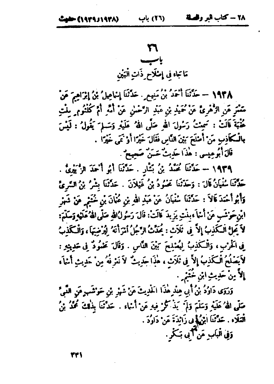 1939 - حَدَّثَنَا مُحَمَّدُ بْنُ بَشَّارٍ قَالَ: حَدَّثَنَا أَبُو أَحْمَدَ الزُّبَيْرِيُّ قَالَ: حَدَّثَنَا سُفْيَانُ، ح وَحَدَّثَنَا مَحْمُودُ بْنُ غَيْلَانَ قَالَ: حَدَّثَنَا بِشْرُ بْنُ السَّرِيِّ، وَأَبُو أَحْمَدَ قَالَا: حَدَّثَنَا سُفْيَانُ، عَنْ عَبْدِ اللَّهِ بْنِ عُثْمَانَ بْنِ خُثَيْمٍ، عَنْ شَهْرِ بْنِ حَوْشَبٍ، عَنْ أَسْمَاءَ بِنْتِ يَزِيدَ قَالَتْ: قَالَ رَسُولُ اللَّهِ صَلَّى اللَّهُ عَلَيْهِ وَسَلَّمَ: " §لَا يَحِلُّ الكَذِبُ إِلَّا فِي ثَلَاثٍ: يُحَدِّثُ الرَّجُلُ امْرَأَتَهُ لِيُرْضِيَهَا، وَالكَذِبُ فِي الحَرْبِ، وَالكَذِبُ لِيُصْلِحَ بَيْنَ النَّاسِ " وَقَالَ مَحْمُودٌ فِي حَدِيثِهِ: «لَا يَصْلُحُ الكَذِبُ إِلَّا فِي ثَلَاثٍ» هَذَا حَدِيثٌ حَسَنٌ غَرِيبٌ لَا نَعْرِفُهُ مِنْ حَدِيثِ أَسْمَاءَ، إِلَّا مِنْ حَدِيثِ ابْنِ خُثَيْمٍ، وَرَوَى دَاوُدُ بْنُ أَبِي هِنْدٍ، هَذَا الحَدِيثَ، عَنْ شَهْرِ بْنِ حَوْشَبٍ، عَنِ النَّبِيِّ صَلَّى اللَّهُ عَلَيْهِ وَسَلَّمَ وَلَمْ يَذْكُرْ فِيهِ عَنْ أَسْمَاءَ، حَدَّثَنَا بِذَلِكَ مُحَمَّدُ بْنُ العَلَاءِ قَالَ: حَدَّثَنَا ابْنُ أَبِي زَائِدَةَ، عَنْ دَاوُدَ وَفِي البَابِ عَنْ أَبِي بَكْرٍ