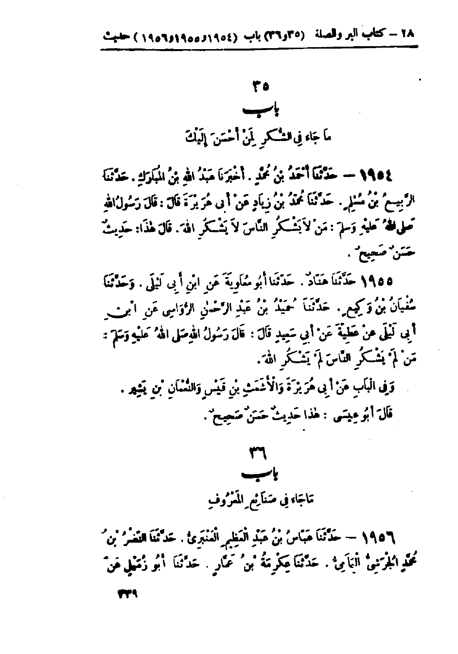 1955 - حَدَّثَنَا هَنَّادٌ قَالَ: حَدَّثَنَا أَبُو مُعَاوِيَةَ، عَنْ ابْنِ أَبِي لَيْلَى، ح وَحَدَّثَنَا سُفْيَانُ بْنُ وَكِيعٍ قَالَ: حَدَّثَنَا حُمَيْدُ بْنُ عَبْدِ الرَّحْمَنِ الرُّوَاسِيُّ، عَنْ ابْنِ أَبِي لَيْلَى، عَنْ عَطِيَّةَ، عَنْ أَبِي سَعِيدٍ قَالَ: قَالَ رَسُولُ اللَّهِ صَلَّى اللَّهُ عَلَيْهِ وَسَلَّمَ: «§مَنْ لَمْ يَشْكُرِ النَّاسَ لَمْ يَشْكُرِ اللَّهَ» وَفِي البَابِ عَنْ أَبِي هُرَيْرَةَ، وَالأَشْعَثِ بْنِ قَيْسٍ، وَالنُّعْمَانِ بْنِ بَشِيرٍ: هَذَا حَدِيثٌ حَسَنٌ
