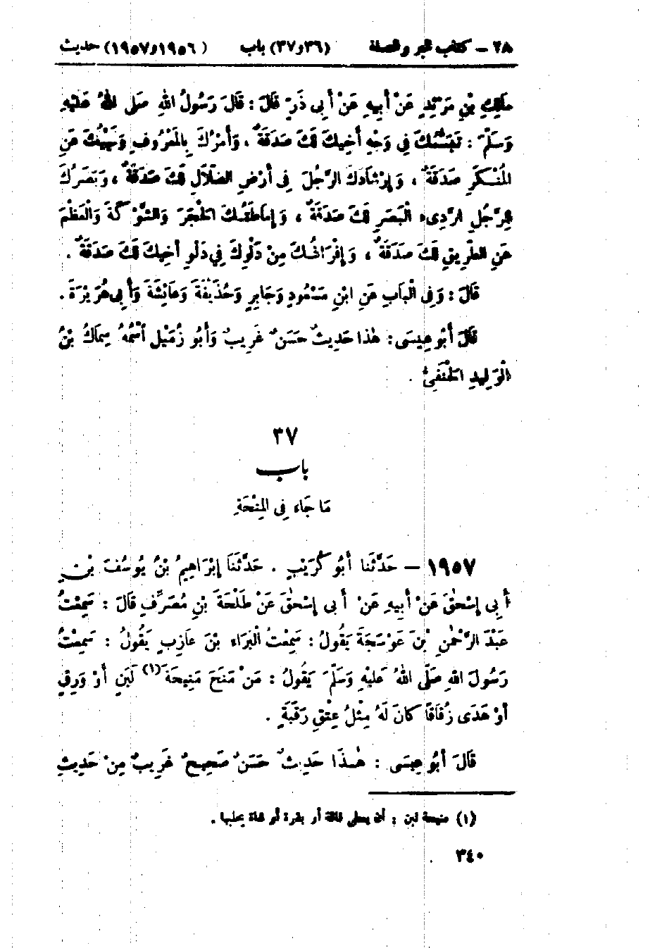 1957 - حَدَّثَنَا أَبُو كُرَيْبٍ قَالَ: حَدَّثَنَا إِبْرَاهِيمُ بْنُ يُوسُفَ بْنِ أَبِي إِسْحَاقَ، عَنْ أَبِيهِ، عَنْ أَبِي إِسْحَاقَ، عَنْ طَلْحَةَ بْنِ مُصَرِّفٍ، قَالَ: سَمِعْتُ عَبْدَ الرَّحْمَنِ بْنَ عَوْسَجَةَ، يَقُولُ: سَمِعْتُ البَرَاءَ بْنَ عَازِبٍ يَقُولُ: سَمِعْتُ رَسُولَ اللَّهِ صَلَّى اللَّهُ عَلَيْهِ وَسَلَّمَ يَقُولُ: «§مَنْ مَنَحَ مَنِيحَةَ لَبَنٍ أَوْ وَرِقٍ أَوْ هَدَى زُقَاقًا كَانَ لَهُ مِثْلَ عِتْقِ رَقَبَةٍ»: هَذَا حَدِيثٌ حَسَنٌ صَحِيحٌ غَرِيبٌ مِنْ حَدِيثِ -[341]- أَبِي إِسْحَاقَ، عَنْ طَلْحَةَ بْنِ مُصَرِّفٍ لَا نَعْرِفُهُ إِلَّا مِنْ هَذَا الوَجْهِ، وَقَدْ رَوَى مَنْصُورُ بْنُ المُعْتَمِرِ، وَشُعْبَةُ، عَنْ طَلْحَةَ بْنِ مُصَرِّفٍ هَذَا الحَدِيثَ، وَفِي البَابِ عَنْ النُّعْمَانِ بْنِ بَشِيرٍ وَمَعْنَى قَوْلِهِ: «مَنْ مَنَحَ مَنِيحَةَ وَرِقٍ» إِنَّمَا يَعْنِي بِهِ: قَرْضَ الدَّرَاهِمِ، قَوْلُهُ: «أَوْ هَدَى زُقَاقًا»: يَعْنِي بِهِ هِدَايَةَ الطَّرِيقِ وَهُوَ إِرْشَادُ السَّبِيلِ